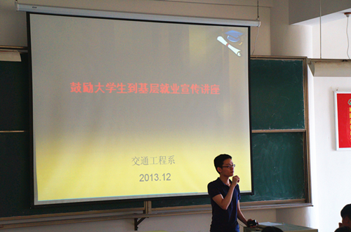 發(fā)布者: 發(fā)布時間:2015-05-18 瀏覽次數(shù):268 交通工程系召開“三支一扶”宣講會 為引導(dǎo)鼓勵高校畢業(yè)生到農(nóng)村去、到基層去、到人民最需要的地方去經(jīng)受鍛煉, 加強基層人才隊伍建設(shè),促進(jìn)基層教育、農(nóng)業(yè)、衛(wèi)生、扶貧等社會事業(yè)發(fā)展,推進(jìn)社會主義新農(nóng)村建設(shè)。2013年12月2日,交通工程系輔導(dǎo)員陳宇鑫老師在1號教學(xué)樓401舉行“三支一扶”宣講會。 陳宇鑫老師介紹了有關(guān)三支一扶的報名條件和審核考察程序,并用往屆畢業(yè)生的親身經(jīng)歷詳細(xì)介紹了三支一扶這一政策,并說明三支一扶這一政策是為高校畢業(yè)生服務(wù)基層提供了具體支持和保障。 此次宣講會同學(xué)們熱情高漲,會后表達(dá)了自己的感想,而且有些同學(xué)也表達(dá)出自己想要通過此次機會參與到基層建設(shè)中去。 ![]() | |||
