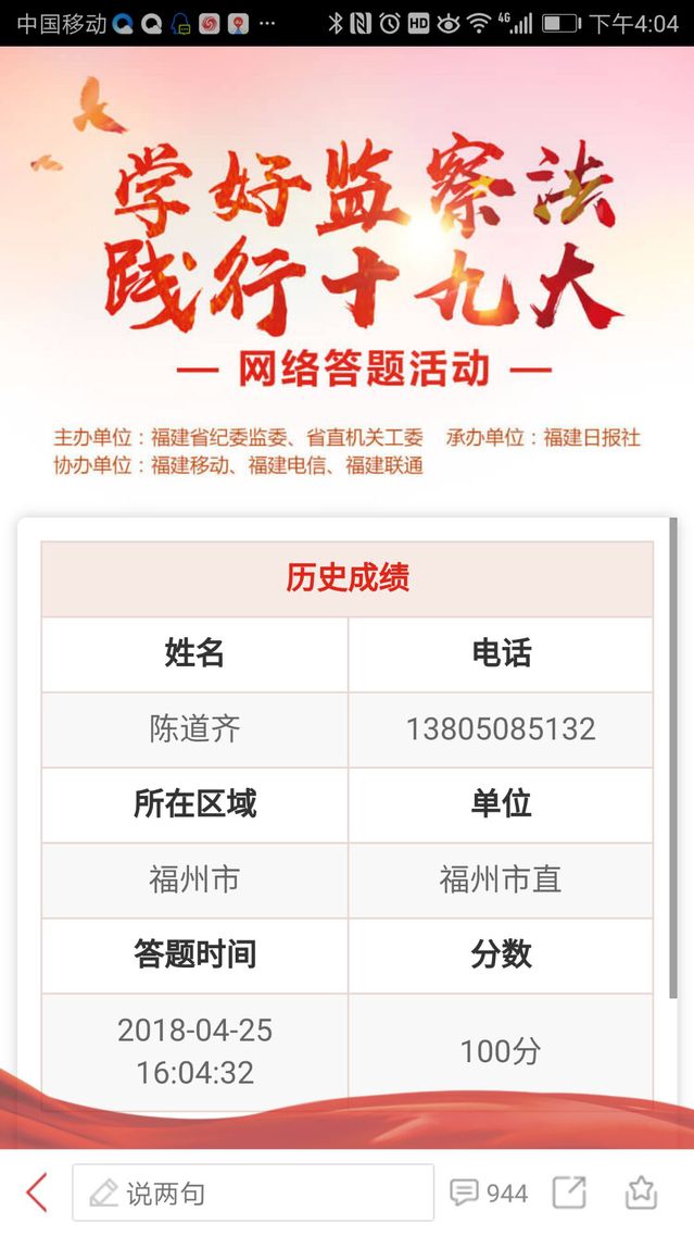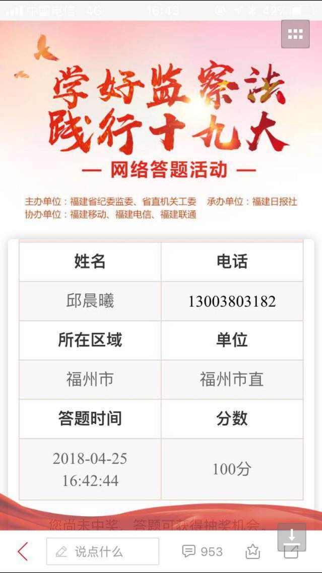 發(fā)布者:交通工程系黨總支 發(fā)布時(shí)間:2018-04-27 瀏覽次數(shù):807 為貫徹黨的十九大精神,落實(shí)黨中央關(guān)于深化國家監(jiān)察體制改革的決策部署,迅速掀起學(xué)習(xí)宣傳《中華人民共和國監(jiān)察法》的熱潮,交通工程系高度重視并認(rèn)真組織教職工參與“學(xué)好監(jiān)察法踐行十九大”網(wǎng)絡(luò)答題活動。全體教職工依托“新福建”客戶端自學(xué)《中華人民共和國監(jiān)察法》,并以優(yōu)異成績通過考試。