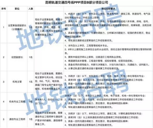 發(fā)布者:蔣璐琳 發(fā)布時間:2018-01-30 瀏覽次數(shù):669 昆明軌道交通四號線PPP項(xiàng)目公司招聘昆明軌道交通地鐵4號線PPP項(xiàng)目B部分投資由昆明軌道集團(tuán)聯(lián)合北京城建設(shè)計(jì)發(fā)展集團(tuán)與中鐵電氣化局集團(tuán)共同組成項(xiàng)目公司實(shí)施。昆明市軌道交通4號線PPP項(xiàng)目總建設(shè)期不超過5年,項(xiàng)目建成后,自試運(yùn)營始計(jì),B部分特許經(jīng)營期為30年。 昆明市軌道交通4號線PPP項(xiàng)目B部分作為昆明市首批PPP項(xiàng)目,財(cái)政部公示的第二批PPP項(xiàng)目之一,具有獨(dú)特的探索性和領(lǐng)先性,是連接主城與呈貢的西北、東南方向輔助線,串聯(lián)了主城西北的國家高新技術(shù)產(chǎn)業(yè)開發(fā)區(qū)、主城中心區(qū)、主城東南的國家經(jīng)濟(jì)技術(shù)開發(fā)區(qū),并向南連接呈貢新城,與1、2號線首期的交融互補(bǔ),將是現(xiàn)代城市生活的再升級、是城市半徑的無限延伸、是引導(dǎo)城市南北發(fā)展的又一核心軸帶、是沿線各片區(qū)駛?cè)氤鞘谢l(fā)展快車道的強(qiáng)勁動力。 線路起于陳家營站,止于昆明火車南站,線路沿金川路、海屯路、學(xué)府路、米軌走廊、彩云北路、貴昆路、官渡17號路(規(guī)劃)、昆洛路、鮮花大道、古滇路、聯(lián)大街、火車站大街布設(shè),線路全長43.396km,均為地下線,設(shè)地下車站29座。規(guī)劃將形成較為密集的客流走廊,設(shè)計(jì)運(yùn)載人數(shù)全網(wǎng)最多、換乘線路最多、線網(wǎng)規(guī)模最大。 根據(jù)工作需要,昆明軌道交通地鐵4號線PPP項(xiàng)目B部分面向社會公開招聘,具體招聘崗位如下: 招聘崗位: