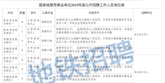 發(fā)布者:蔣璐琳 發(fā)布時間:2018-03-30 瀏覽次數(shù):2095 國家鐵路局招聘公告 國家鐵路局安全技術中心等事業(yè)單位面向具有工作經(jīng)歷的社會在職人員公開招聘工作人員,擬招聘崗位為事業(yè)單位在冊正式人員崗位,福利待遇按國家有關規(guī)定執(zhí)行?,F(xiàn)將有關事宜公告如下: 一、招聘崗位及條件 (一)基本條件 1.具有中華人民共和國國籍; 2.遵守憲法和法律,具有良好的品行; 3.具有崗位所需要的專業(yè)或技能條件,具有適應崗位要求的身體條件; 4.曾因犯罪受過刑事處罰的人員和曾被開除公職的人員,以及法律規(guī)定不得聘(錄)用的其他情形人員,不得報考。 應聘人員的工作經(jīng)歷、年齡計算截至2018年3月。 (二)具體崗位及條件 詳見《國家鐵路局事業(yè)單位2018年度公開招聘工作人員崗位表》(附表1)。