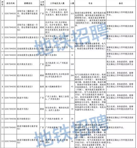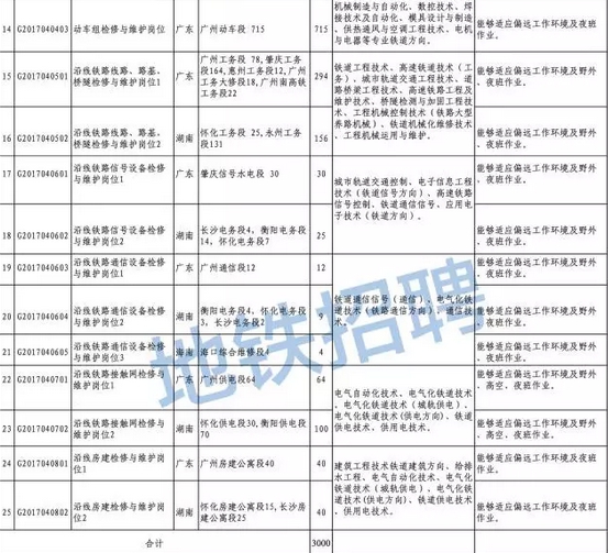 發(fā)布者:蔣璐琳 發(fā)布時(shí)間:2017-10-26 瀏覽次數(shù):477 廣州鐵路公司招聘公告 廣州鐵路(集團(tuán))公司根據(jù)企業(yè)經(jīng)營發(fā)展需要,擬招聘全日制普通高等院校大專(高職)畢業(yè)生,現(xiàn)將有關(guān)事項(xiàng)公告如下: 一、招聘計(jì)劃 本批次計(jì)劃招聘鐵路主專業(yè)大專(高職)畢業(yè)生3000人,具體崗位、人數(shù)、專業(yè)及要求詳見附件。