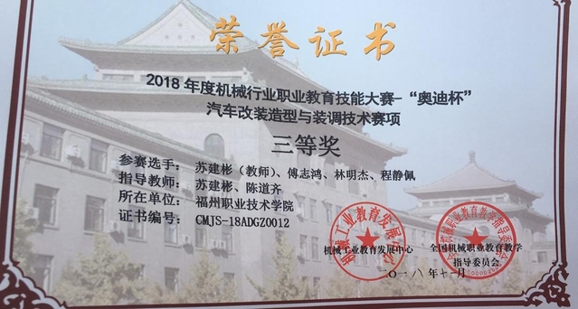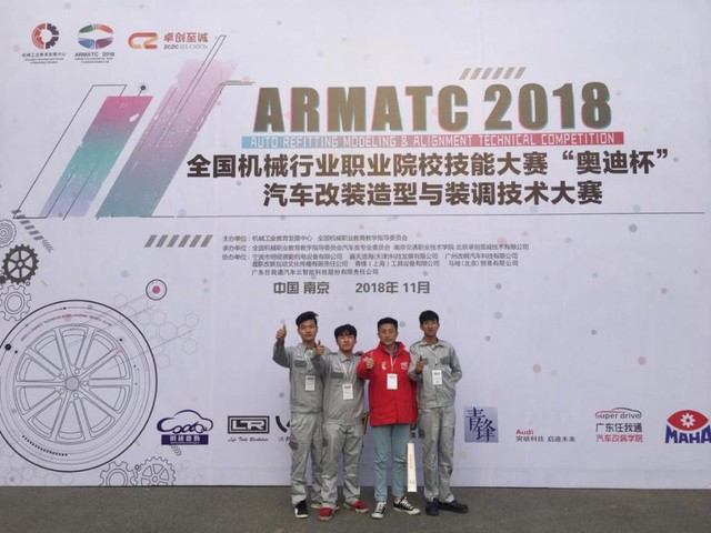 我系參加2018年全國(guó)機(jī)械行業(yè)職業(yè)院校技能大賽暨“奧迪杯”汽車(chē)改裝造型與裝調(diào)技術(shù)大賽獲得三等獎(jiǎng)