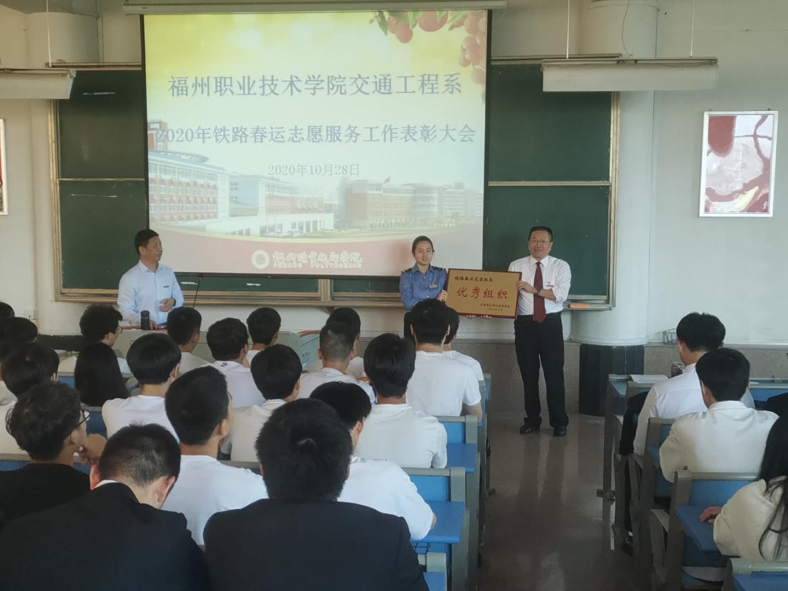 發(fā)布者:謝薇 發(fā)布時(shí)間:2020-11-01 瀏覽次數(shù):244 交通工程學(xué)院舉辦2020年鐵路春運(yùn)志愿服務(wù)工作 總結(jié)表彰大會(huì) 交通工程學(xué)院2020-10-28 2020年10月28日下午3點(diǎn),交通工程學(xué)院在1號(hào)教學(xué)樓301大教室舉辦2020年鐵路春運(yùn)志愿服務(wù)工作總結(jié)表彰大會(huì)。福州火車站團(tuán)委劉娜書記、交通工程學(xué)院黨政領(lǐng)導(dǎo)、專任教師以及2019級(jí)、2020級(jí)城市軌道交通專業(yè)所有同學(xué)參加此次表彰大會(huì)。 劉娜書記宣讀表彰決定,全國(guó)鐵路共青團(tuán)委員會(huì)授予“福州職業(yè)技術(shù)學(xué)院交通工程系”為2020年鐵路春運(yùn)志愿服務(wù)“優(yōu)秀組織”稱號(hào),授予鄭冰玉等30名同學(xué)為2020年鐵路春運(yùn)志愿服務(wù)“優(yōu)秀志愿者”。劉娜書記和學(xué)院黨政領(lǐng)導(dǎo)共同為獲獎(jiǎng)集體和個(gè)人頒獎(jiǎng)。交通工程學(xué)院黨總支劉常勇書記做最后的總結(jié)發(fā)言,劉書記表示同學(xué)們?cè)诖哼\(yùn)中受教育,長(zhǎng)才干,得實(shí)惠,同時(shí)鞏固了思政教育的成果。課程思政得到充分發(fā)揮的同時(shí),同學(xué)們的表現(xiàn)也得到社會(huì)的肯定與贊揚(yáng)。 今年是交通工程學(xué)院第9年服務(wù)福州火車站春運(yùn),通過(guò)春運(yùn)志愿者服務(wù)工作,將專業(yè)技能、企業(yè)需求、志愿服務(wù)融為一體,實(shí)現(xiàn)了全方位育人。 (文/林鑫 圖/林凱)