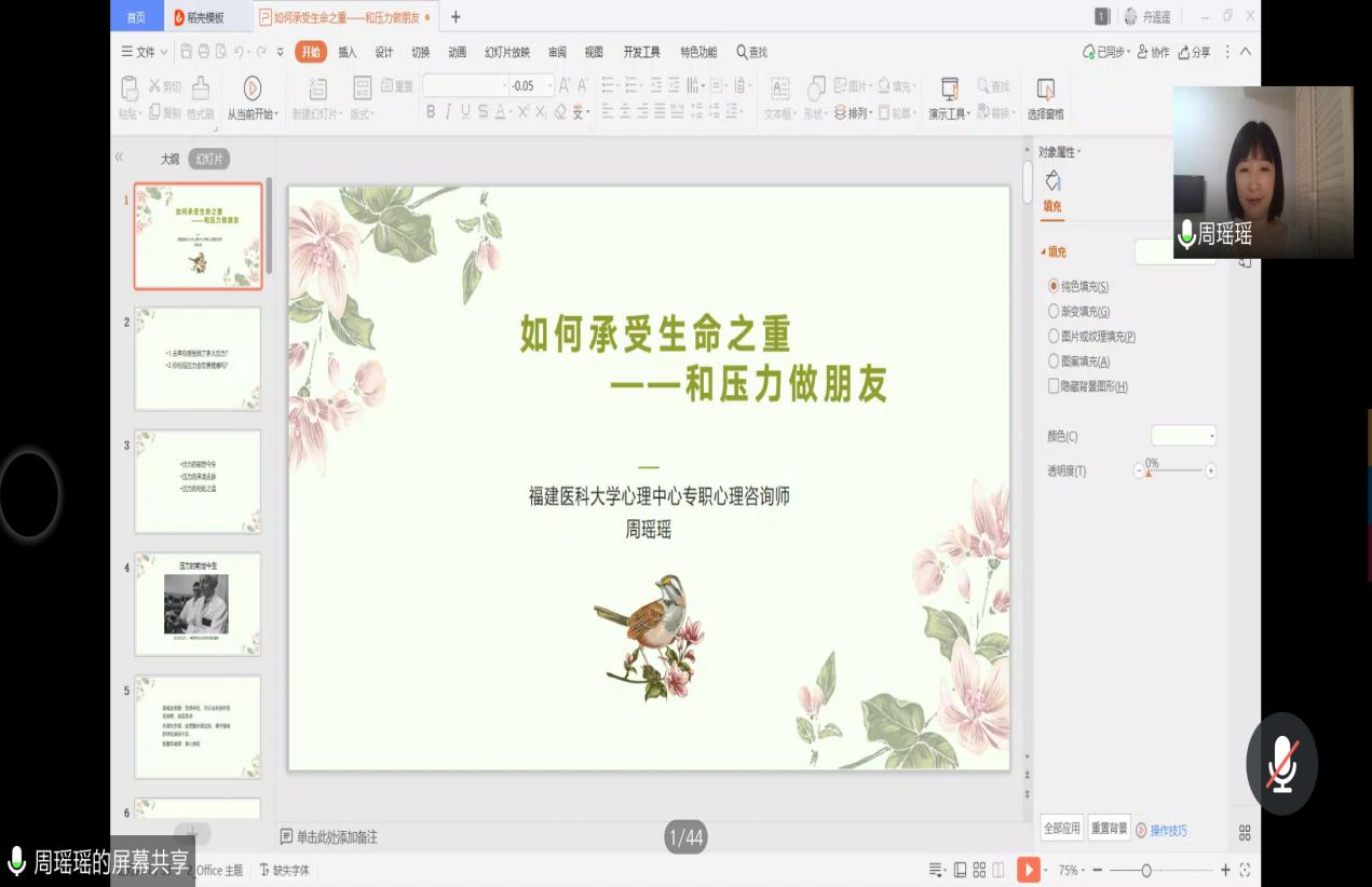 發(fā)布者: 發(fā)布時(shí)間:2020-07-21 瀏覽次數(shù):133 交通工程學(xué)院2020-7-17 為更好引導(dǎo)學(xué)生做好疫情期間的個(gè)人心理防護(hù)、理性看待疫情,加強(qiáng)對(duì)學(xué)生的心理疏導(dǎo)與幫扶,交通工程學(xué)院邀請(qǐng)了福建醫(yī)科大學(xué)心理中心專職心理咨詢師周瑤瑤老師通過騰訊會(huì)議開設(shè)了“如何承受生命之重,和壓力做朋友”為主題的心理講座。 講座中,周瑤瑤老師從壓力的前世今生、壓力的來龍去脈和壓力的相處之道三個(gè)方面為同學(xué)們講解如何承受生命之重,和壓力做朋友。講座歷時(shí)2個(gè)小時(shí),周瑤瑤老師不僅舉例通俗易懂而且分享了許多減壓小技巧,也讓同學(xué)們知道了如何應(yīng)對(duì)壓力。 講座結(jié)束后,同學(xué)們紛紛表示,周瑤瑤老師用專業(yè)的心理知識(shí)和有趣的案例分析作了一次非常精彩的講座,增強(qiáng)了大家關(guān)注心理健康的意識(shí),對(duì)在疫情期間緩解自身壓力,構(gòu)建積極健康的心理品質(zhì)起到了非常重要的作用。 (圖文/陳鑫)