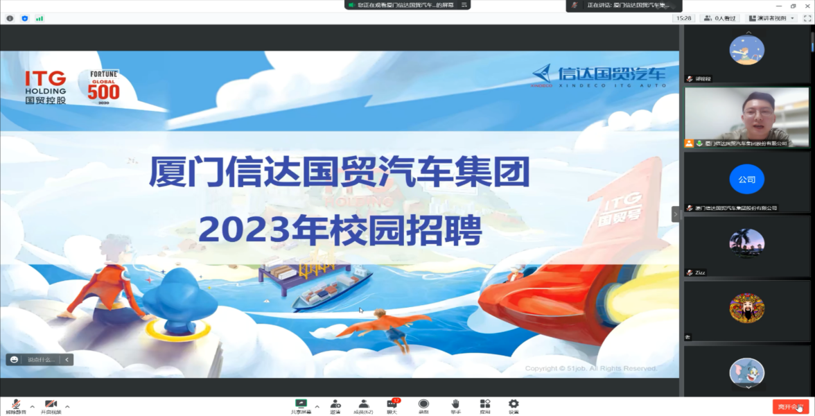 為切實(shí)做好交通工程學(xué)院畢業(yè)生就業(yè)工作,大力構(gòu)建畢業(yè)生與用人單位的交流平臺(tái),積極為用人單位輸送應(yīng)用型人才。11月2號(hào)晚,交通工程學(xué)院蘇建彬老師邀請(qǐng)廈門(mén)信達(dá)國(guó)貿(mào)汽車(chē)集團(tuán)股份有限公司的王文斌經(jīng)理為我系2023屆汽車(chē)專業(yè)畢業(yè)生開(kāi)展線上校園招聘會(huì)。