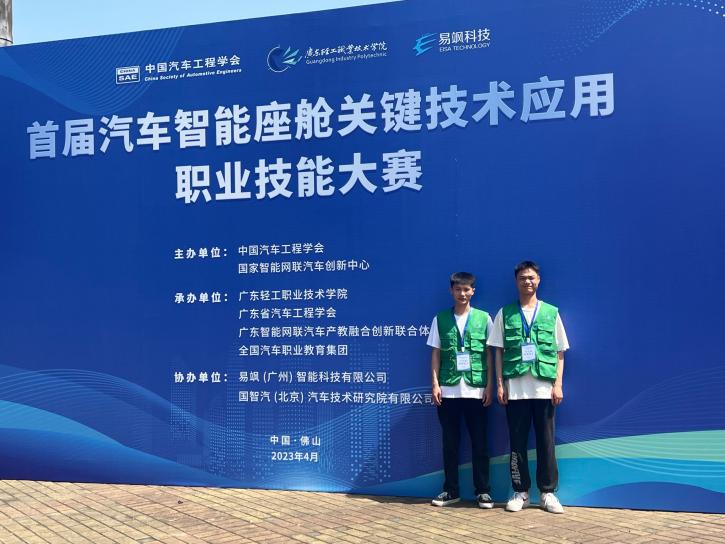 發(fā)布者: 發(fā)布時(shí)間:2023-04-18 瀏覽次數(shù):230 交通工程系 2023-4-18 4月15至16日,由中國汽車工程學(xué)會(huì)、國家智能網(wǎng)聯(lián)汽車創(chuàng)新中心聯(lián)合主辦,廣東輕工職業(yè)技術(shù)學(xué)院、廣東省汽車工程學(xué)會(huì)、廣東智能網(wǎng)聯(lián)汽車產(chǎn)教融合創(chuàng)新聯(lián)合體、全國汽車職業(yè)教育集團(tuán)聯(lián)合承辦的首屆全國汽車智能座艙關(guān)鍵技術(shù)應(yīng)用職業(yè)技能大賽在廣東佛山順利舉行。 本次大賽分2天進(jìn)行,參賽選手需分別完成“智能座艙控制技術(shù)”和“視覺交互技術(shù)”兩個(gè)競賽模塊,共有33所參賽單位的50余支隊(duì)伍參賽。我系由2021級汽車智能1班木豪、周朱奇2名選手組成的智能座艙關(guān)鍵技術(shù)應(yīng)用代表隊(duì)(指導(dǎo)老師:林少芳,唐思欣)參加了此次競賽。兩位同學(xué)發(fā)揚(yáng)努力拼搏的精神,經(jīng)過激烈的角逐,榮獲“智能座艙關(guān)鍵技術(shù)”(學(xué)生組)二等獎(jiǎng),為學(xué)院贏得了榮譽(yù)。此次比賽展示了我系智能汽車技術(shù)領(lǐng)域人才“前后通吃、軟硬兼?zhèn)洌瑣徫贿w移能力強(qiáng)”的新風(fēng)采! (圖/文唐思欣)
