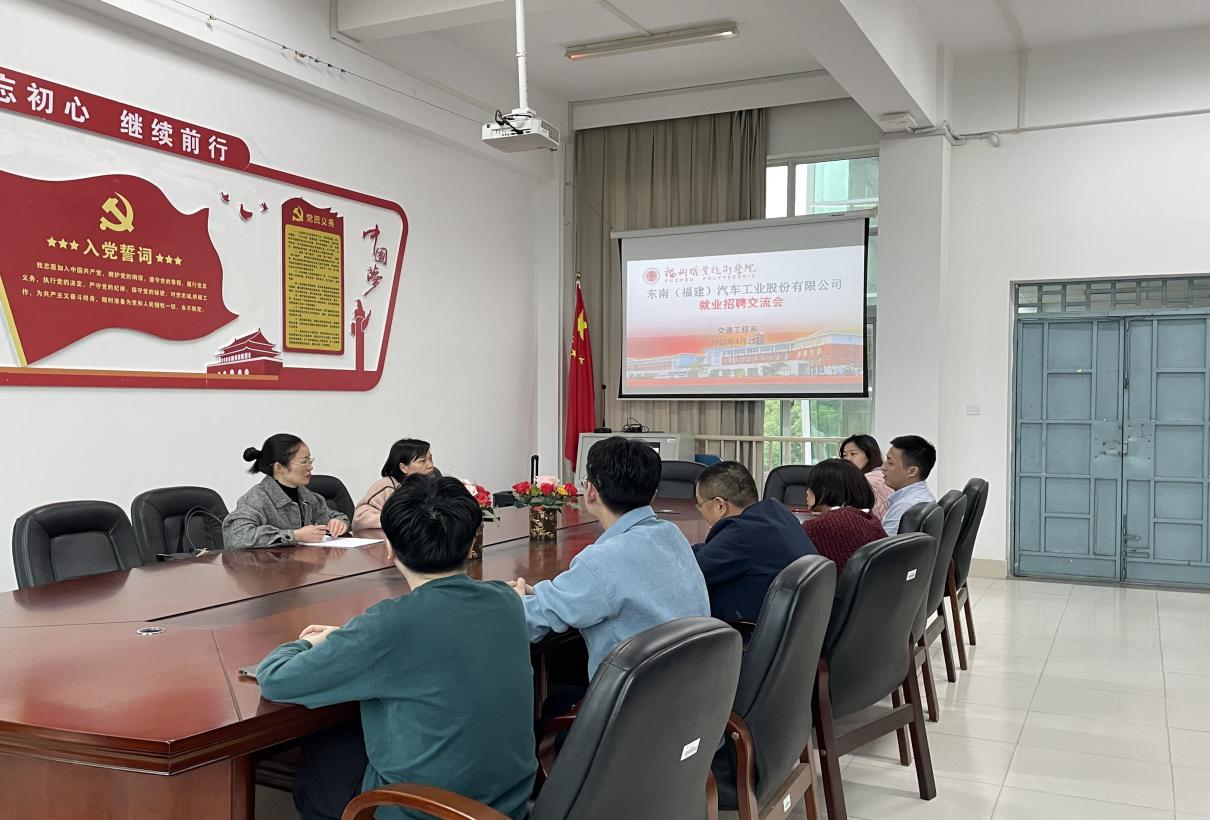 為拓寬畢業(yè)生就業(yè)渠道和資源,全力促進(jìn)畢業(yè)生更加充分更高質(zhì)量的就業(yè);為做好畢業(yè)生實(shí)習(xí)工作,助力畢業(yè)生留筑就業(yè)。2023年4月25日,交通工程系開展“訪企拓崗促就業(yè)”系列活動(dòng),黨總支書記劉常勇邀請東南(福建)汽車工業(yè)有限公司人力部盧娘招經(jīng)理一行人到交通工程系同師生舉行就業(yè)招聘交流會(huì)。