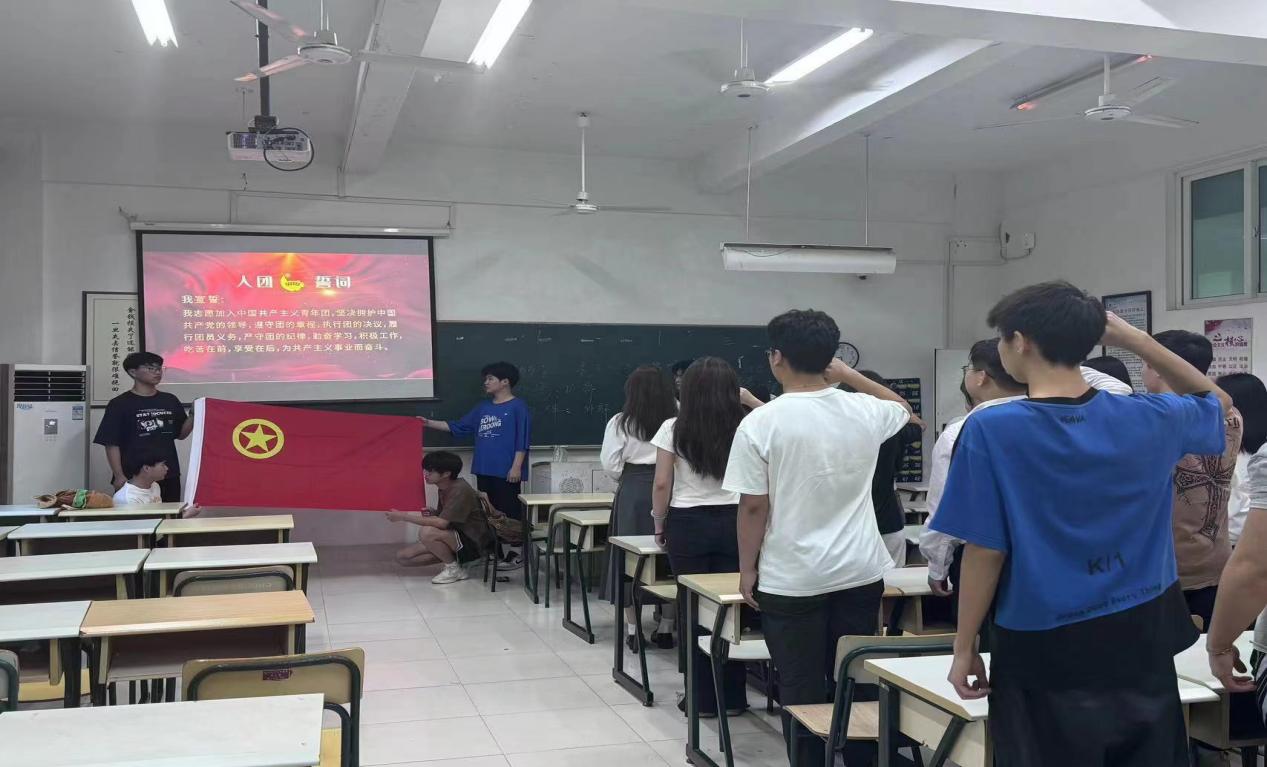 在老團員代表游發(fā)偉同學的領(lǐng)誓下,新團員們舉起右手莊嚴宣誓:“我志愿加入中國共產(chǎn)主義青年團,堅決擁護中國共產(chǎn)黨的領(lǐng)導,遵守黨的章程,執(zhí)行黨的決議,履行團員義務(wù),嚴守團的紀律,勤奮學習,積極工作,吃苦在前,享樂在后,為共產(chǎn)主義事業(yè)而奮斗?!鼻啻菏难裕甙盒蹨?,表達了團員們對共青團組織的無限向往和為團組織增光添彩的豪邁激情。我系各團支部積極開展重溫入團儀式、重溫入團誓詞活動,紀念五四運動105周年,回顧入團的初心和使命,感受共青團的崇高精神,增強永遠跟黨走的信念信心。重溫入團儀式在全體團員齊唱團歌中順利落下帷幕。