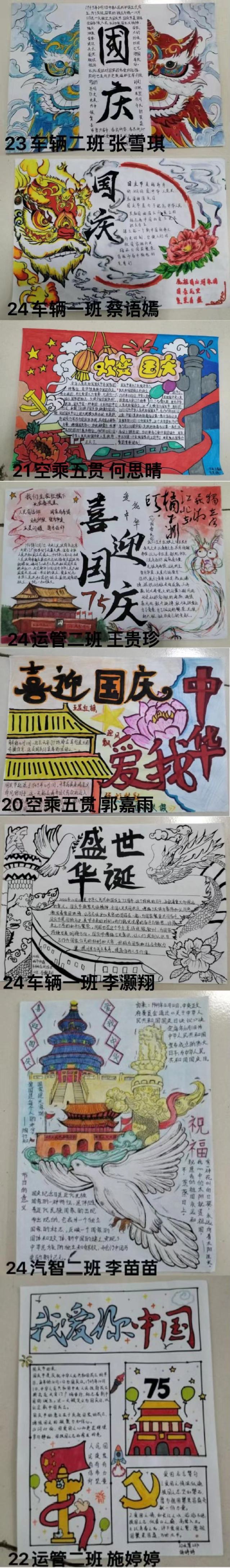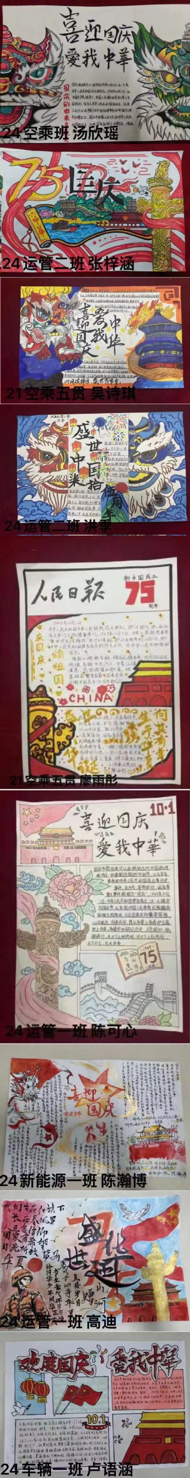 發(fā)布者: 發(fā)布時(shí)間:2024-09-28 瀏覽次數(shù):284 為慶祝中華人民共和國成立75周年,培養(yǎng)學(xué)生的愛國主義情懷,激發(fā)學(xué)生愛國愛黨熱情,切實(shí)落實(shí)立德樹人根本任務(wù),也為進(jìn)一步渲染節(jié)日氛圍,推進(jìn)校園文化建設(shè)和班級文化建設(shè),交通工程學(xué)院于近日組織舉辦了“喜迎國慶,愛我中華”手抄報(bào)主題展示活動(dòng)。 此次手抄報(bào)活動(dòng),同學(xué)們積極參與,共收到各班級72份作品。在創(chuàng)作過程中,同學(xué)們用心搜集資料,自主設(shè)計(jì)版面,盡情揮灑色彩。他們將自己對祖國的熱愛與祝福融入進(jìn)他們的作品當(dāng)中,一幅幅作品生動(dòng)展現(xiàn)了祖國的輝煌成就與美麗風(fēng)光,傳遞出濃厚的愛國情感,從而體現(xiàn)了新時(shí)代大學(xué)生的愛國情懷。 此次活動(dòng)不僅鍛煉了同學(xué)們的繪畫和書寫能力,更展示了他們的才華,讓同學(xué)們深入了解了祖國的歷史和文化,起到了潛移默化的教育作用,進(jìn)一步激發(fā)了同學(xué)們的愛國熱情,為國慶佳節(jié)增添了濃厚的節(jié)日氛圍。 (文/鐘建平 圖/鄭弘宜)