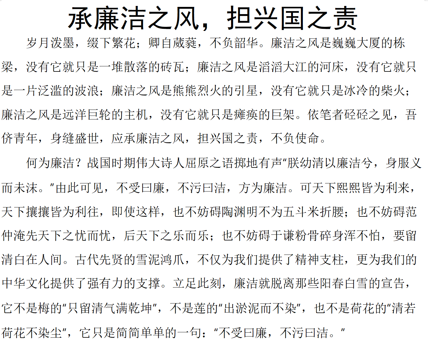 本次征文比賽圍繞“廉潔”主題,結(jié)合個(gè)人經(jīng)歷、學(xué)習(xí)體會(huì)或社會(huì)現(xiàn)象,闡述對(duì)廉潔文化的理解和認(rèn)識(shí)。本次比賽共收到12份征文作品,參賽同學(xué)紛紛結(jié)合自身感悟,講述廉潔故事,暢談廉潔體會(huì),展現(xiàn)出青年在廉潔自律方面的思考和行動(dòng)。稿件內(nèi)容積極向上,觀點(diǎn)鮮明,邏輯清晰,語(yǔ)言流暢,充分體現(xiàn)了新時(shí)代青年對(duì)廉潔文化的深刻理解和積極踐行?;顒?dòng)以征文為載體,將廉潔文化融入青年的學(xué)習(xí)和生活,讓廉潔意識(shí)在青年心中生根發(fā)芽,扣好廉潔從政“第一??圩印?。