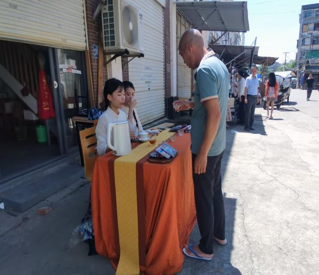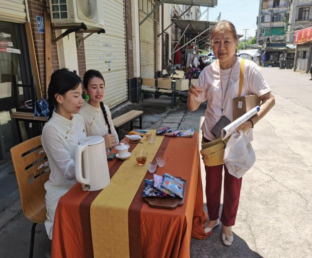 二、禮言相融·志愿同行 實(shí)踐隊(duì)獨(dú)辟蹊徑,將普通話推廣與福州特色茶禮深度融合。在莊南社區(qū),隊(duì)員們化身“文化使者”,將“斟茶七分滿”“叩指謝茶”等方言茶禮術(shù)語(yǔ)轉(zhuǎn)化為標(biāo)準(zhǔn)普通話表達(dá),架起文化活態(tài)傳承的語(yǔ)言橋梁。此外,實(shí)踐隊(duì)員深入村居,理論宣講、防詐宣傳、民情調(diào)研的交談細(xì)致入微。在志愿服務(wù)中,青年學(xué)子們真切感知村民需求,將“奉獻(xiàn)、友愛、互助、進(jìn)步”的志愿精神化作提升村民幸福感、獲得感的務(wù)實(shí)之舉。