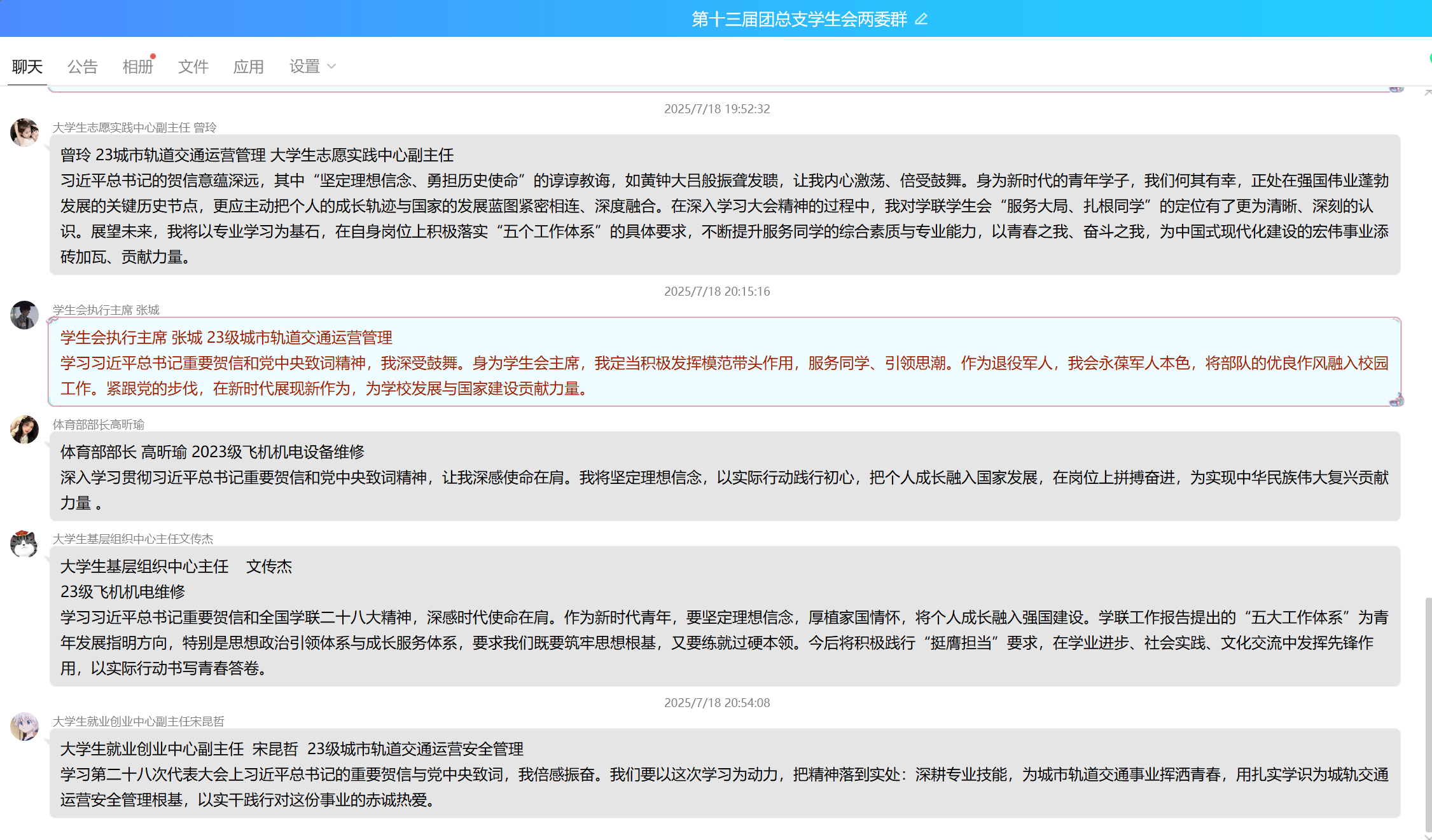 發(fā)布者:交通工程學院 發(fā)布時間:2025-07-24 瀏覽次數(shù):203 為學習宣傳貫徹習近平總書記重要賀信和黨中央致詞精神,貫徹落實全國學聯(lián)二十八大工作部署,近日,交通工程學院組織全體學生通過學習研討會、主題團日、青馬學堂等方式,深入學習習近平總書記致全國青聯(lián)十四屆全委會、全國學聯(lián)二十八大的重要賀信和黨中央致詞精神。 專題學習采用線下自學+線上研討的方式開展,團總支引導學生們要堅持原原本本學,逐字逐句學習領會習近平總書記重要賀信和黨中央致詞,深刻把握核心要義和精神實質。我院團總支書記高凌飛與兩委學生干部一起學習研討,她號召學生干部要緊緊圍繞新時代新征程黨的中心任務,在工作中抓緊抓實理論武裝、切實當好橋梁紐帶,熱情服務廣大同學解決急難愁盼,并結合暑期“三下鄉(xiāng)”、“返家鄉(xiāng)”等項目,團結帶動廣大同學將小我融入大我,在實踐中發(fā)揮自我價值,彰顯交通學子的風采。 交通工程學院通過此次專題學習活動,進一步激發(fā)了全體學生的責任感與使命感。學生們紛紛表示,將把學習成果轉化為實際行動,積極投身于學院建設和國家發(fā)展之中。團總支將持續(xù)推動學習宣傳貫徹工作走深走實,引導學生在新時代新征程中展現(xiàn)新作為,為實現(xiàn)中華民族偉大復興的中國夢貢獻交通學子的青春力量。 圖文/李琦 指導老師/高凌飛