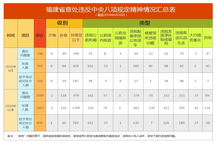 2016年6月,福建查處違反中央八項(xiàng)規(guī)定精神問(wèn)題298件,處理503人,給予黨紀(jì)政紀(jì)處分166人。截至今年6月30日,福建查處違反中央八項(xiàng)規(guī)定精神情況如下: