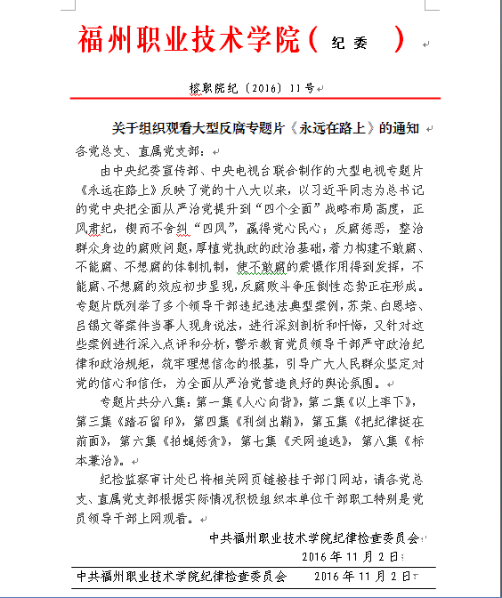 榕職院紀(jì)﹝2016﹞11號關(guān)于組織觀看大型反腐專題片《永遠(yuǎn)在路上》的通知