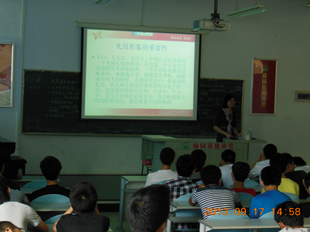 在講座上,陳思穎老師通過(guò)分享身邊的小故事小情節(jié),結(jié)合自身的經(jīng)驗(yàn),給同學(xué)們?cè)敿?xì)的介紹人的外在形象及儀態(tài)給人的第一印象中的重要性,又結(jié)合視頻講述了標(biāo)準(zhǔn)的坐姿、站姿和走姿,以及一些人們不雅不文明的視頻來(lái)加深同學(xué)們對(duì)于自己形象的認(rèn)識(shí)及塑造好形象的動(dòng)力。