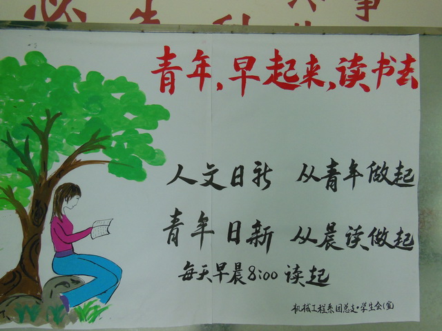 為了營造良好的校風(fēng)、學(xué)風(fēng)和班風(fēng),督促學(xué)生養(yǎng)成良好的行為習(xí)慣,培養(yǎng)學(xué)生的自覺性和紀(jì)律性,同時提高工科學(xué)生的人文素養(yǎng),機械工程系全系范圍組織了晨讀活動。在此次晨讀活動開展之前,系部領(lǐng)導(dǎo)、輔導(dǎo)員進行了全面動員和晨讀課程規(guī)劃,系團委學(xué)生會印發(fā)了《機械工程系早讀活動倡議書》,并且得到了學(xué)生們的積極響應(yīng)。