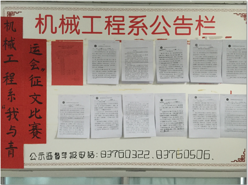 我系全體同學(xué)在機(jī)械工程系團(tuán)總支、學(xué)生會的帶領(lǐng)下積極參與本次征文活動,各展所長,用筆桿描繪出一幅幅精彩的畫面,同時(shí)我系也組建了一支由專業(yè)教師和優(yōu)秀學(xué)生組成的評委團(tuán)對學(xué)生作品進(jìn)行認(rèn)真評選,并對優(yōu)秀作品進(jìn)行表彰公示。