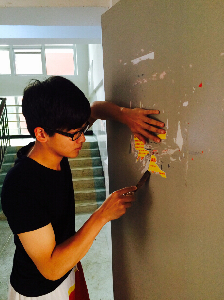 在“五四”青年節(jié)期間,機械工程系組織青年學生和團員干部在11#學生公寓樓開展了“美化校園、文明共享”的校園牛皮癬專項整治活動,為校園美化奉獻自己的一份力量。在本次活動中,青年學生有的拎著涂料、鏟子,有的手拿鋼刷、小鋼刀、鋼絲球,有的則提著掃把、畚斗,大家相互配合,相互幫助,干勁十足,對墻面上的每一塊“牛皮癬”進行認真清理。經(jīng)過大家的辛勤勞動,共清理公寓樓層內(nèi)各類廣告100多張,恢復了公寓墻面的清潔。同時,廣大青年學生還深入宿舍,宣傳文明校園和五四青年節(jié)相關(guān)知識,倡導每個學生都承擔一份責任,為國家、校園的建設(shè)添磚加瓦。