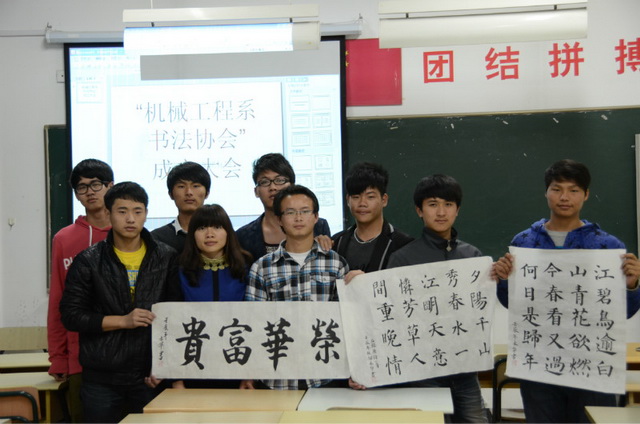 2013年3月8日晚上八點(diǎn),機(jī)械工程系一群書法愛好者經(jīng)過精心的準(zhǔn)備和策劃,在綜合樓109召開了“機(jī)械工程系書法協(xié)會(huì)”成立大會(huì),標(biāo)志著機(jī)械工程系第一個(gè)學(xué)生課外活動(dòng)團(tuán)體應(yīng)運(yùn)而生。