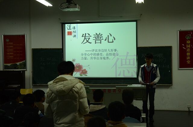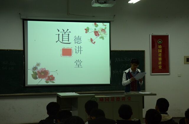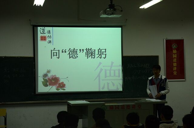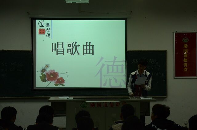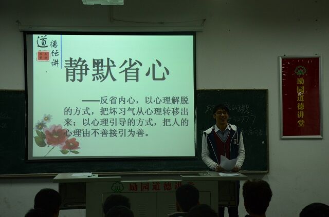 講堂開始,首先由陳亮賢首先介紹了道德講堂的意義和內(nèi)容,接著由張樹堅同學(xué)帶領(lǐng)現(xiàn)場所有同學(xué)一起進行了道德講堂“靜默省心、唱歌曲、誦經(jīng)典、學(xué)模范、發(fā)善心、向“德”鞠躬、送吉祥、一堂一善事”八個部分內(nèi)容,并倡導(dǎo)廣大學(xué)生積極參加勵園道德講堂“一堂一善事”活動。整個講堂環(huán)環(huán)相扣,精彩不斷;通過開展道德講堂活動,促進了師生自覺地將道德理念內(nèi)化于心、外化于行,以實際行動自覺踐行社會主義道德規(guī)范,爭當(dāng)新時期“四德”居民,成為道德實踐的傳播者、踐行者和受益者。勵園道德講堂活動在同學(xué)們熱烈的掌聲中圓滿結(jié)束。