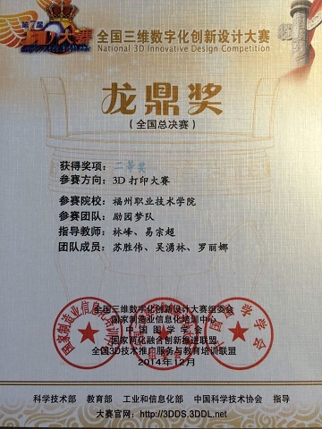 2014年12月7日,在江蘇常州舉行的2014年第七屆全國3D大賽3D打印總決賽上,由學(xué)院機械工程系學(xué)生蘇勝偉、吳湧林、羅麗娜組成,林峰、易宗超老師指導(dǎo)的“勵園夢隊”一舉奪得大賽二等獎。