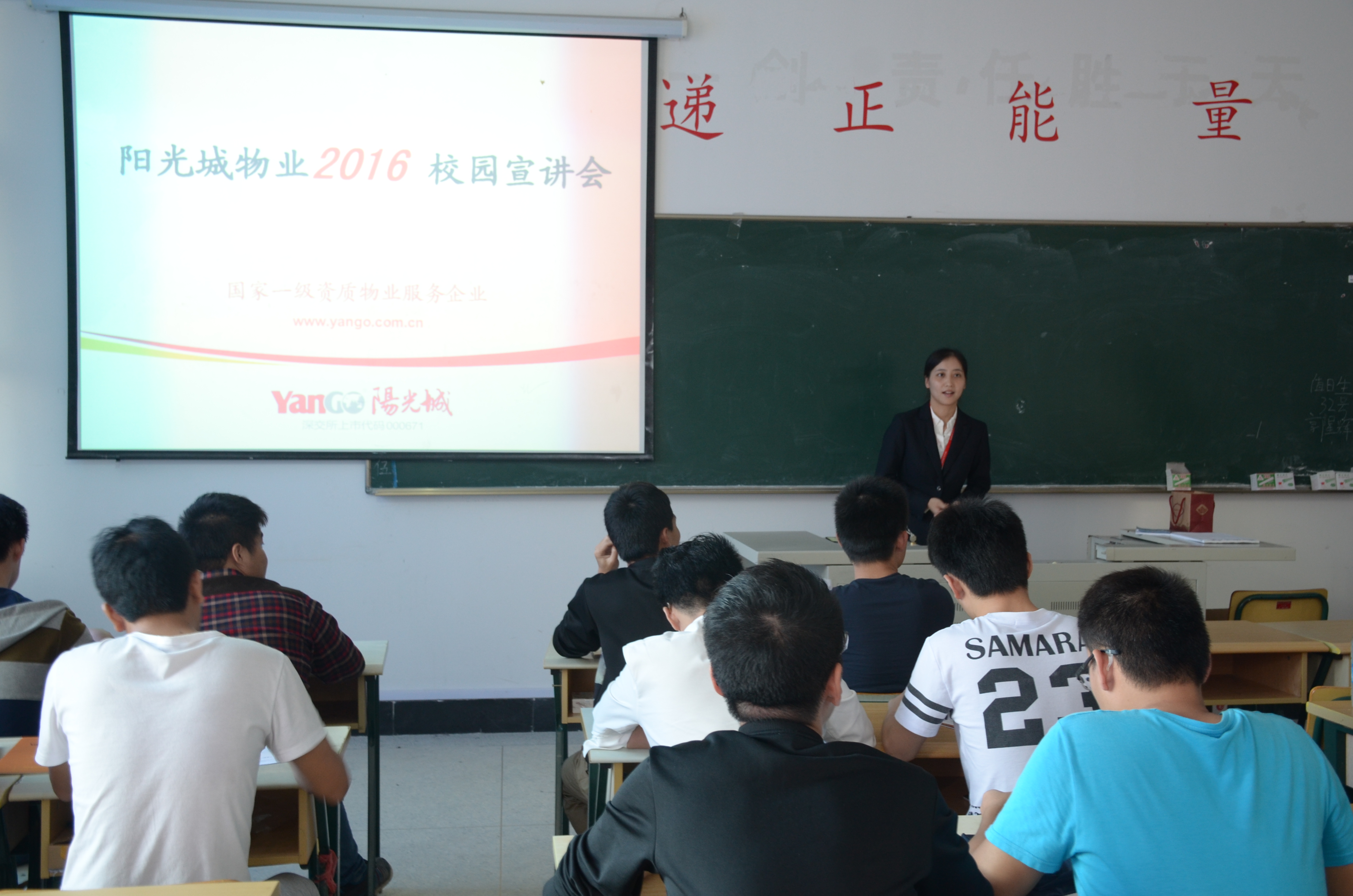 2015年11月16日,福建陽光城物業(yè)服務(wù)有限公司針對機械工程系2016屆全體畢業(yè)生在實訓(xùn)樓408教室召開專場招聘會,該公司是陽光城集團的全資子公司,成立于2001年7月,是一家具有獨立法人資格的一級資質(zhì)的專業(yè)物業(yè)服務(wù)企業(yè),現(xiàn)為中國物業(yè)管理協(xié)會會員單位、福建省及福州市物業(yè)管理協(xié)會常務(wù)理事單位。