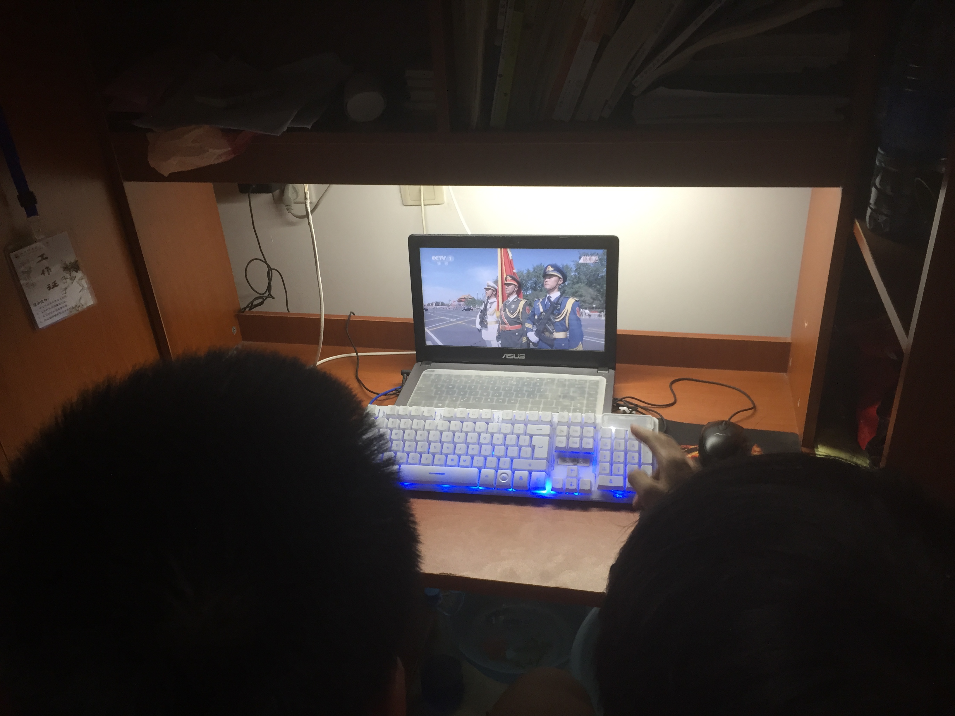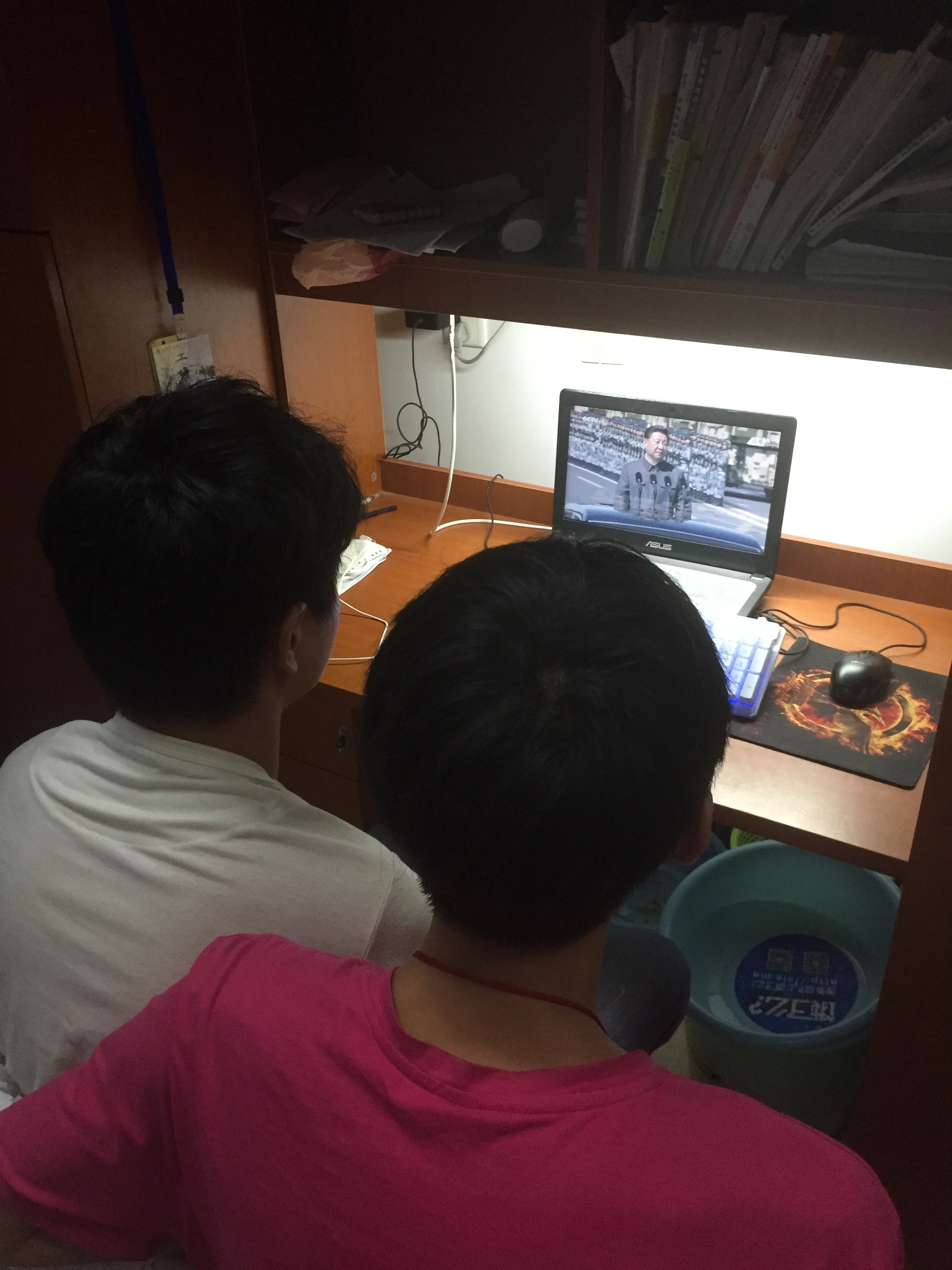 3號早上,同學們自發(fā)來到學生第一食堂三樓演播廳,靜靜等待閱兵儀式的開始。也有部分同學留在宿舍圍坐在電腦面前與舍友一起觀看這歷史性的一刻。