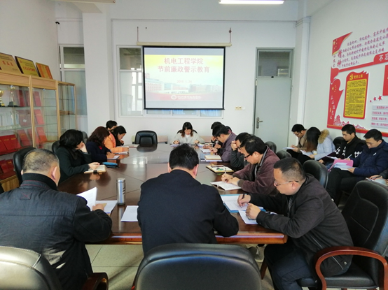 2019年1月24日,機電工程學院組織全體黨員、教職工召開節(jié)前廉政警示教育暨集體廉政提醒談話會。