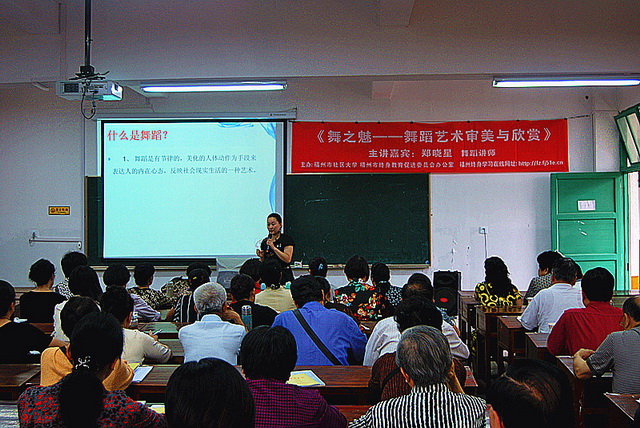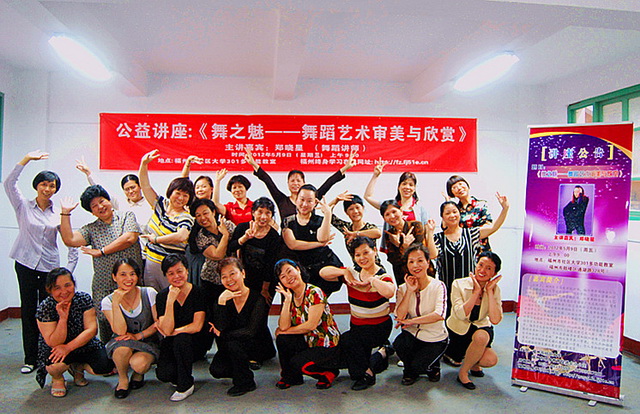 2012年5月9日上午,福州市社區(qū)大學和福州市終身教育促進委員會辦公室聯(lián)合舉辦社大月度講壇,本次講座主講嘉賓是福州職業(yè)技術(shù)學院人文社科系講師、福州市舞蹈協(xié)會會員鄭曉星老師,主題為《舞之魅――舞蹈藝術(shù)審美與欣賞》,廣大市民、舞蹈愛好者等60余人聆聽講座。 鄭曉星在講座中指出,舞之魅,魅在運用舞蹈語言、節(jié)律、表情和構(gòu)圖等多種基本元素,塑造出具有直觀性的和動態(tài)性的舞蹈形象,表達人們的思想感情;培養(yǎng)對舞蹈藝術(shù)的審美和欣賞能力,讓高雅藝術(shù)走進大眾生活、走進社區(qū)。她希望熱愛舞蹈的學員朋友除參加課堂學習外,還可登陸福州社區(qū)大學網(wǎng)站( http://fz.fj51e.cn ),注冊“福州終身學習在線”學員,免費學習舞蹈視頻課程。 講座結(jié)束,應熱情聽眾朋友的請求,在教學樓大廳,鄭曉星老師還進行示范性教學活動,演繹了開心的、可愛的“舞之魅”。