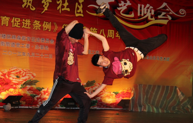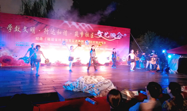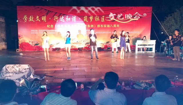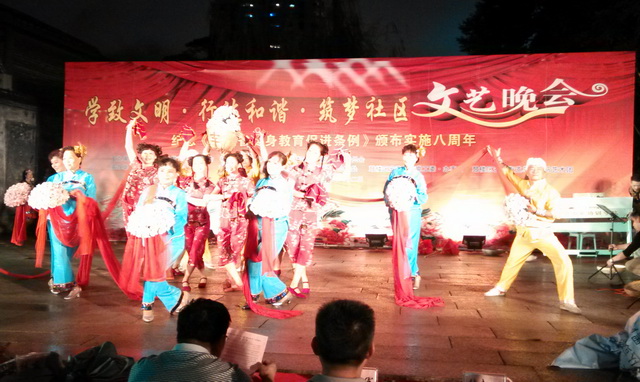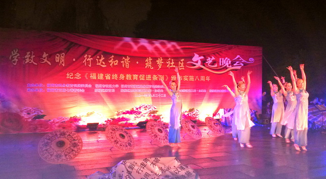 2013年9月22日晚,一場以“學致文明•行達和諧•筑夢社區(qū)暨紀念《福建省終身教育促進條例》頒布實施八周年”為主題的社區(qū)文藝晚會在三坊七巷隆重舉行。晚會由福州市終身教育促進委員會、福州市社區(qū)大學、福州市鼓樓區(qū)終身教育促進委員會主辦,由福州市三坊七巷管委會、鼓樓區(qū)教育局、鼓樓區(qū)南街街道黨工委•辦事處、鼓樓區(qū)安泰街道黨工委•辦事處、鼓樓區(qū)安泰街道烏山社區(qū)白馬藝術(shù)團等單位承辦。 晚7時,由福州市社區(qū)大學選送的一曲熱鬧歡快的開場舞蹈《江南style》拉開了文藝晚會的序幕。整臺晚會節(jié)目形式多樣,內(nèi)容豐富多彩,許多節(jié)目由社區(qū)群眾自編自導自演,如時裝隊表演的《夢想花開》、健身舞《再唱瀏陽河》、男女對唱《只要有你》、民族舞《春風春雨古巷》、團扇秧歌《吳越弄弦》,大合唱《我相信》等,尤其福州職業(yè)技術(shù)學院學生藝術(shù)團街舞隊帶來的街舞《熱力四射》,其精彩的表演,引爆全場氣氛,博得掌聲不斷,將晚會氣氛推向高潮。雖然天公不作美,時不時飄下絲絲細雨,但是歡快、和諧依舊貫穿晚會始終。 福州職業(yè)技術(shù)學院經(jīng)濟系學生志愿者服務隊與社區(qū)志愿者們一道開展志愿服務,快樂分享活動,受到主辦方領導好評。