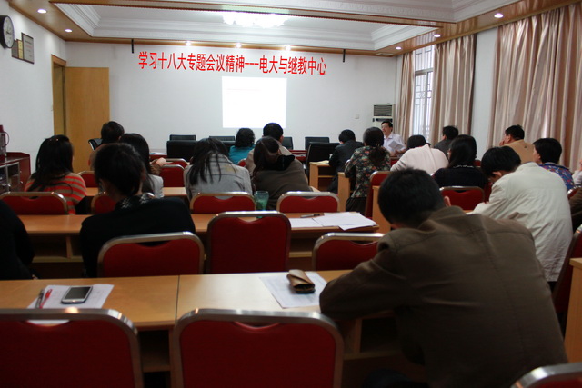 11月12日下午,電大與繼教中心吳發(fā)水副主任作為福州市理論基地的一位專家,為本部門員工做了首場宣講,與大家共同解讀學(xué)習(xí)十八大胡錦濤總書記的工作報(bào)告,幫助大家深刻領(lǐng)會十八大提出的重大理論觀點(diǎn)、重大戰(zhàn)略思想、重大工作部署。悅?cè)搜矍虻腜PT、精彩簡捷的講解,無不鼓舞人心、催人奮進(jìn),大家認(rèn)真傾聽,并做好相關(guān)筆記。幾位黨員還就學(xué)習(xí)十八大精神作了發(fā)言,談了學(xué)習(xí)體會,大家一致認(rèn)為,要在思想上高度重視,把好學(xué)習(xí)關(guān);更要在行動上立足本職,做好服務(wù)事。 (電大與繼教中心黨支部)