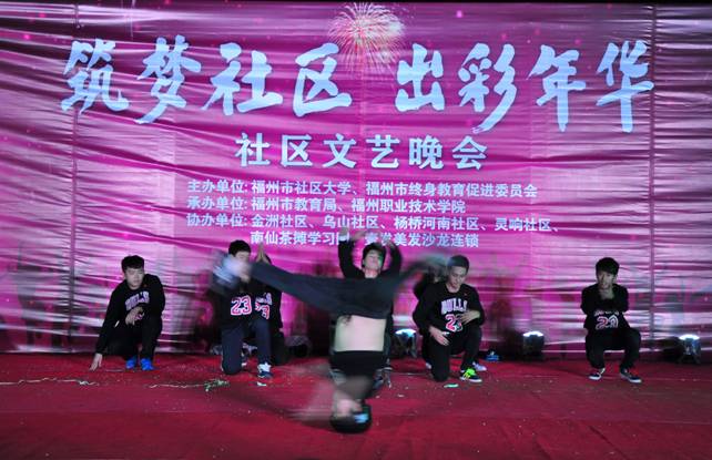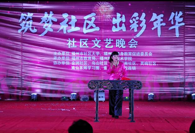 2014年12月9日晚7點(diǎn),在福州市倉(cāng)山榕城廣場(chǎng)舉辦一臺(tái)主題為“筑夢(mèng)社區(qū)?出彩年華”大型社區(qū)文藝晚會(huì)。晚會(huì)由福州市社區(qū)大學(xué)和福州市終身促進(jìn)委員會(huì)聯(lián)合主辦,福州市教育局、福州職業(yè)技術(shù)學(xué)院承辦,金洲社區(qū)、烏山社區(qū)、南仙茶攤學(xué)習(xí)圈等單位協(xié)辦。 福州職業(yè)技術(shù)學(xué)院黨委書(shū)記陳承茂代表主辦單位上臺(tái)發(fā)表了熱情洋溢的致辭。講話(huà)中他指出,我們要認(rèn)真學(xué)習(xí)宣傳貫徹十八屆三中、四中全會(huì)和習(xí)近平總書(shū)記在視察福建時(shí)的重要講話(huà)精神,積極培育和踐行社會(huì)主義核心價(jià)值觀(guān);加強(qiáng)社區(qū)教育、終身教育,構(gòu)筑終身教育體系;筑夢(mèng)社區(qū)歡樂(lè)地,出彩年華艷陽(yáng)天。追夢(mèng)路上,我們豪情滿(mǎn)懷;圓夢(mèng)途中,我們信心百倍。讓我們攜起手來(lái),為文明社區(qū)、和諧社區(qū)建設(shè)齊心協(xié)力,為學(xué)習(xí)型城市建設(shè)錦上添花。 由福州市社區(qū)大學(xué)金洲社區(qū)教學(xué)點(diǎn)夕陽(yáng)紅舞蹈隊(duì)編排的《中國(guó)夢(mèng)》率先拉開(kāi)了文藝晚會(huì)的帷幕。晚會(huì)共表演14個(gè)文娛節(jié)目,魅力四射的舞蹈,激情澎湃的歌曲,妙趣橫生的小品,幻影莫測(cè)的魔術(shù);既有社區(qū)居民自編自演的歌曲舞蹈,也本土氣息厚重的曲藝小品;既有被居民戲稱(chēng)為“草根園藝”的“說(shuō)學(xué)逗唱”上舞臺(tái),也有來(lái)自高校、團(tuán)體高雅藝術(shù)的“吹拉評(píng)彈”下社區(qū);上承經(jīng)典,下接地氣。各類(lèi)節(jié)目精彩紛呈,活力綻放;載歌載舞,別具特色。如南仙茶攤學(xué)習(xí)圈圈主、“獅子頭”第七代傳人翁文峰先生等創(chuàng)作的《茉莉情?莫離情》被中央電視臺(tái)選為福州話(huà)歌曲代表作之一,并成為中央臺(tái)《茉莉窨城》的主題曲,原唱者林書(shū)文、林明老師蒞臨現(xiàn)場(chǎng),激情對(duì)唱,贏(yíng)得社區(qū)群眾陣陣掌聲。 福州市社區(qū)大學(xué)客座教授、福州大學(xué)陽(yáng)光學(xué)院藝術(shù)系教授、女高音歌唱家王美玉的歌伴舞將《錦繡前程》演繹得淋漓盡致,大氣磅礴,把晚會(huì)推向了高潮。晚會(huì)結(jié)束,觀(guān)看的市民朋友仍意猶未盡,沉浸在快樂(lè)幸福之中,流連忘返。 福州職業(yè)技術(shù)學(xué)院、閩江學(xué)院、福建工程學(xué)院、南仙茶攤學(xué)習(xí)圈閩都文化志愿小分隊(duì)林佩瀅等27人參與晚會(huì)的志愿服務(wù)。壹發(fā)美發(fā)沙龍連鎖孫其忠率其“小蘋(píng)果”舞蹈隊(duì)義務(wù)為演職人員進(jìn)行化妝及形象設(shè)計(jì)。福州主流媒體跟蹤報(bào)道本次活動(dòng)。(福州市社區(qū)大學(xué)供稿)  黨委書(shū)記陳承茂致辭 開(kāi)場(chǎng)舞《中國(guó)夢(mèng)》(金洲社區(qū)) ?唱《看花》(福州市曲藝團(tuán)) 男生獨(dú)唱《卓瑪》(金洲社區(qū)) 現(xiàn)代舞《小蘋(píng)果》(壹發(fā)美發(fā)沙龍連鎖) 原創(chuàng)小品《閩都別記》(南仙茶攤學(xué)習(xí)圈之閩都文化志愿者小分隊(duì)) 《太極功夫扇》(楊橋河南社區(qū)) 福州民間方言吟唱《十二月水果歌》、《一粒橄欖扔過(guò)溪》 (福州市社區(qū)大學(xué)客座教授方炳桂) 魔術(shù)《幻覺(jué)繩子》(金洲社區(qū)) 舞蹈《山海情》(烏山社區(qū)) 評(píng)話(huà)《六合彩風(fēng)波》(靈響社區(qū)) 對(duì)唱《茉莉情•莫離情》(南仙茶攤學(xué)習(xí)圈) (備注:林書(shū)文,專(zhuān)業(yè)音樂(lè)人,宦溪中學(xué)音樂(lè)老師;林明,閩江學(xué)院教師,首屆福州話(huà)比賽冠軍 。中央臺(tái)紀(jì)錄片《茉莉窨城》的主題曲原唱組合)
