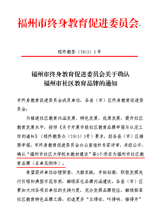 接福州市終身教育促進委員會《關(guān)于確認福州市社區(qū)教育品牌的通知》(榕終教委〔2015〕5號)文,確認“福州市社區(qū)大學(xué)校本教材建設(shè)”等5個項目為福州市社區(qū)教育品牌。 我們將珍惜榮譽,開拓創(chuàng)新,發(fā)揮社區(qū)大學(xué)先行引領(lǐng)和典型示范作用,繼續(xù)深化品牌的內(nèi)涵建設(shè),充分發(fā)揮品牌效應(yīng),繼續(xù)探索社區(qū)教育特色道路,力爭打造出更多“立得住、叫得響、推得開”的深受廣大市民喜愛的的社區(qū)教育品牌。(福州市社區(qū)大學(xué)供稿)  |