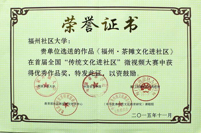 福州市社區(qū)大學選送的《福州•茶攤文化進社區(qū)》在參加全國首屆“傳統(tǒng)文化進社區(qū)”微視頻大賽中榮獲“優(yōu)秀作品獎”。 據(jù)悉,本次大賽由國家開放大學、中國音樂學院、廈門市海滄區(qū)人民政府、教育部社區(qū)教育研究培訓中心和國家社科基金“十二五”重點課題《中華優(yōu)秀傳統(tǒng)文化教育研究》課題組聯(lián)合舉辦,旨在完善中華傳統(tǒng)文化教育的精神,建設優(yōu)秀傳統(tǒng)文化傳承體系,弘揚中華優(yōu)秀傳統(tǒng)文化,創(chuàng)建學習型和諧社區(qū),讓傳統(tǒng)文化進社區(qū)、進校園、進家庭、進心靈,記錄心靈震撼時刻。 本次大賽共收到全國各地參賽視頻513部。主辦方通過線上優(yōu)秀作品展播、網(wǎng)絡投票、專家多輪評選等形式,產生一等獎5名,二等獎10名,三等獎15名,優(yōu)秀作品獎30名。(福州市社區(qū)大學供稿)