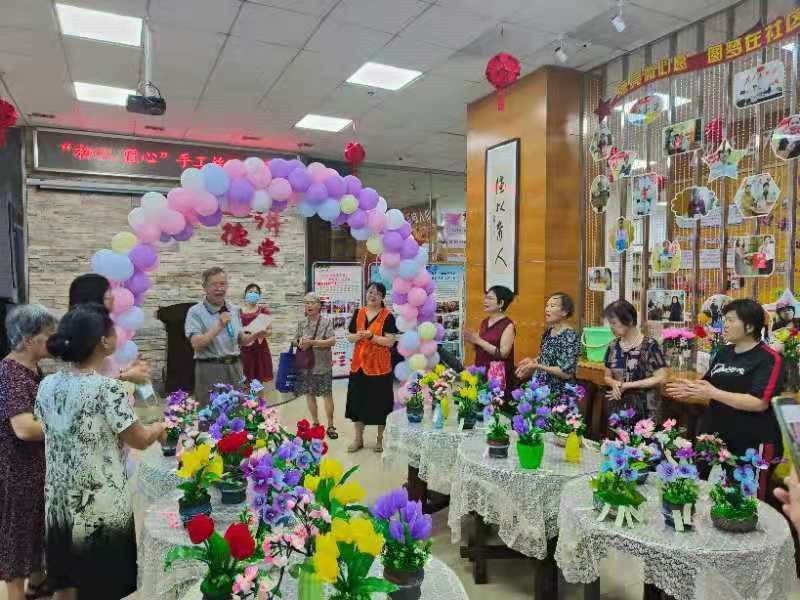 結(jié)課儀式上,舉辦了絲網(wǎng)花作品展,展示學(xué)員制作的絲網(wǎng)花作品。作品有櫻花、郁金香、玫瑰、百合、蝴蝶蘭、康乃馨、小金魚等,并共同制作一面絲網(wǎng)花編制而成黨旗,向建黨100周年獻(xiàn)禮。作品展上大家共同鑒賞,評(píng)出最美十件優(yōu)秀作品。通過課程的學(xué)習(xí)和作品展示評(píng)比,社區(qū)居民在提升手工技藝的同時(shí)也提升了藝術(shù)的鑒賞能力。