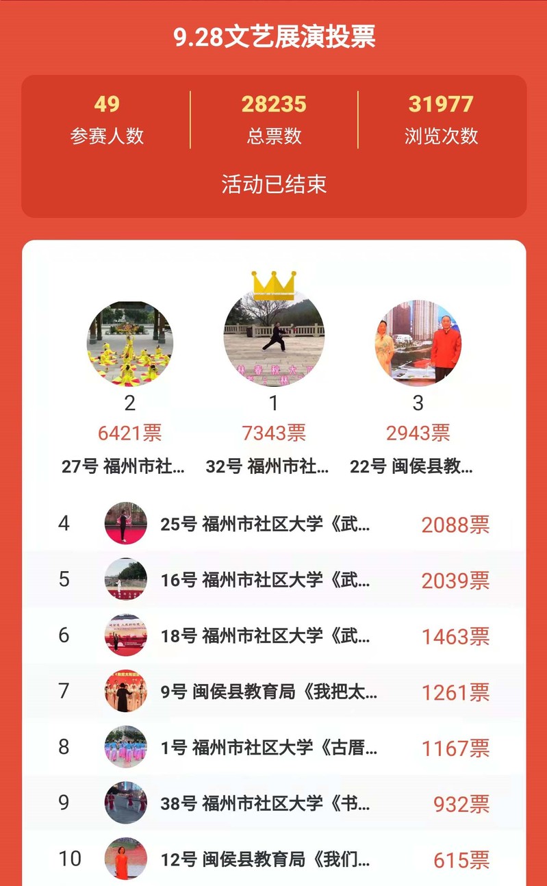 根據(jù)《福建省終身教育促進委員會關于開展 2021年“9·28終身教育活動日”暨全民終身學習活動周的通知》要求,在福州市社區(qū)大學微信小程序平臺開展文藝展演投票活動,共有49個作品參與了角逐,總票數(shù)達到28235票。本著公平、公正、公開的原則,截至2021年12月1日,根據(jù)線上投票統(tǒng)計結果,決出前十名,現(xiàn)將評選結果公示如下: