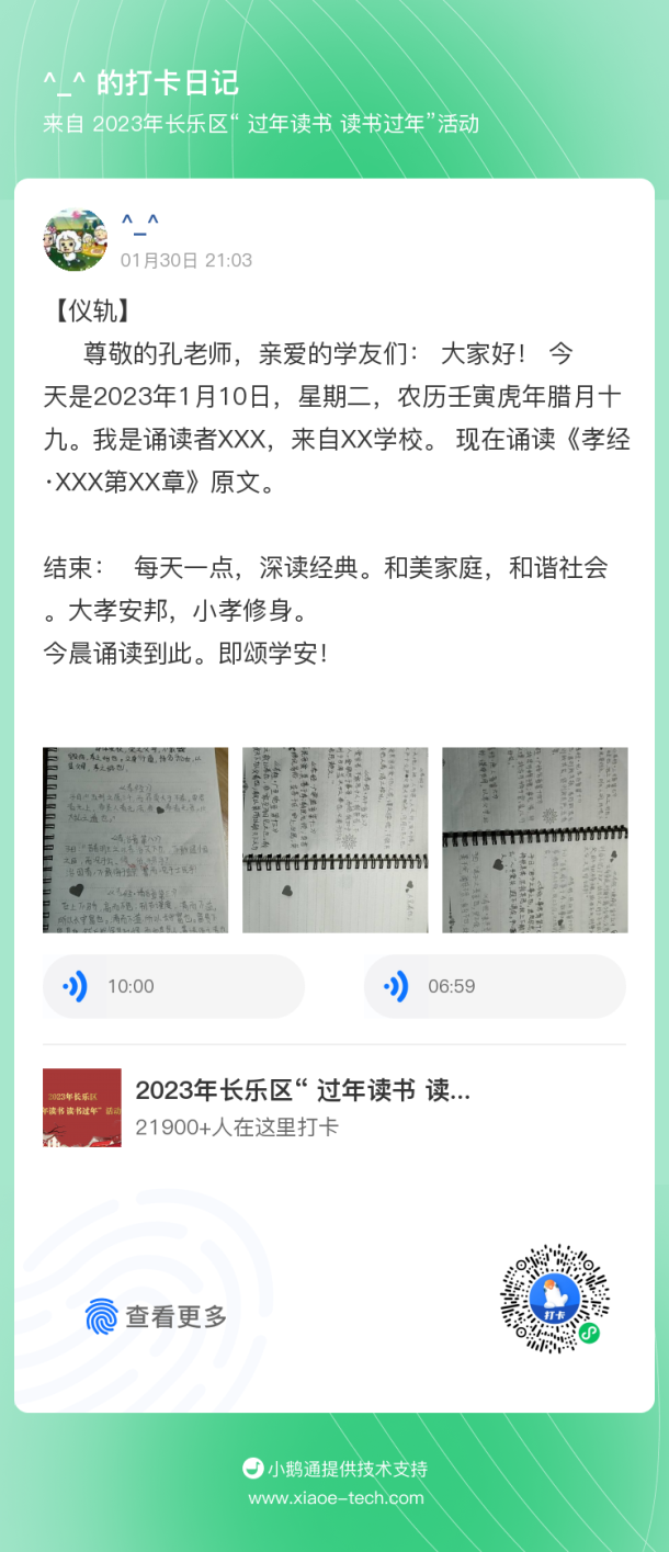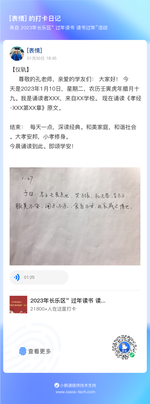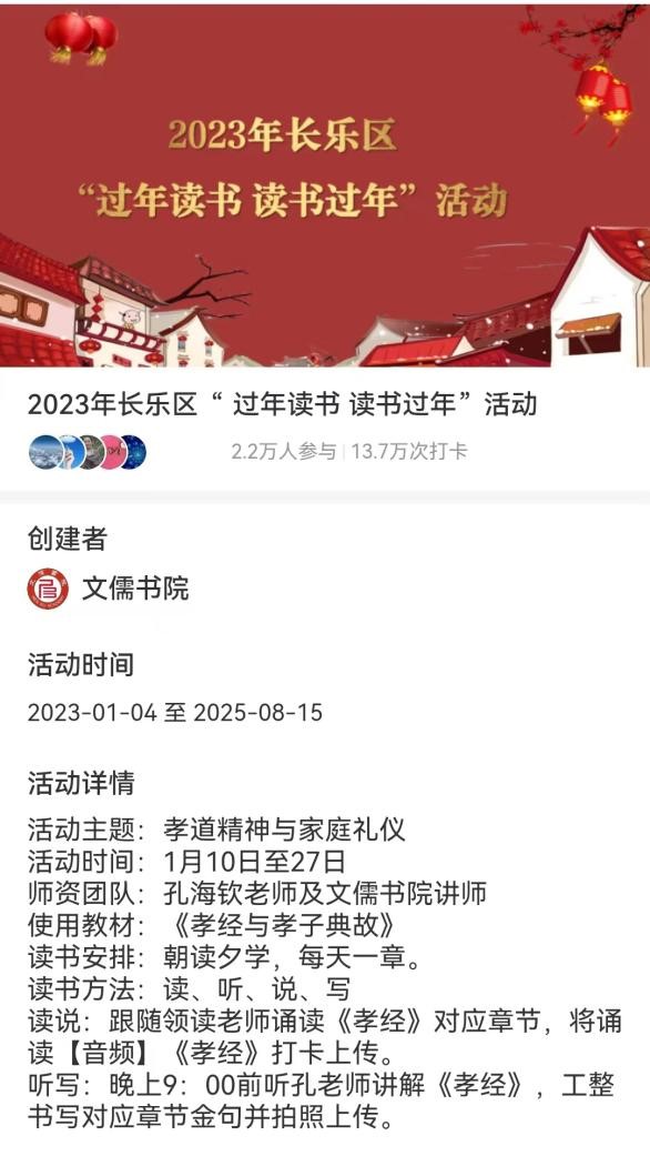 孝道是傳統(tǒng)文化的根基,是做人的根本。在長樂區(qū)委區(qū)政府的指導(dǎo)下,于2023年1月10日至27日間長樂區(qū)教育局與福州市社區(qū)大學(xué)文儒學(xué)院聯(lián)袂組織“孝道精神與家庭禮儀”為主題的“過年讀書,讀書過年”活動,長樂區(qū)各校師生、家長2.2萬人積極參與線上共學(xué)《孝經(jīng)》、抄寫金句,累計13.7萬次打卡。