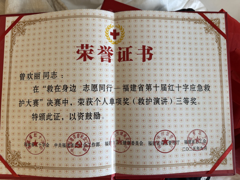 我校師生團(tuán)隊5人代表福州市紅十字救護(hù)隊參賽。經(jīng)過二十多天的封閉集訓(xùn)與激烈的現(xiàn)場競賽,我院教師曾歡麗獲得由福建省紅十字會、中共福建省委社會工作部、福建省衛(wèi)生健康委員會、福建省應(yīng)急管理廳、福建省總工會聯(lián)合頒發(fā)的個人單項獎(創(chuàng)傷救護(hù))三等獎、個人單項獎(救護(hù)演講)三等獎。
