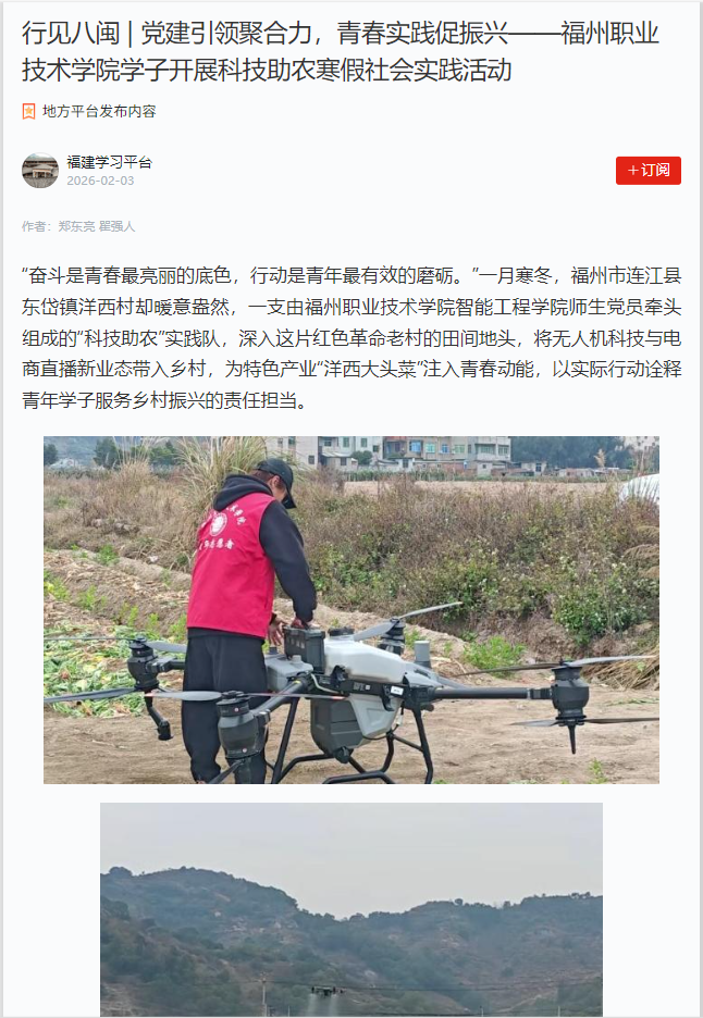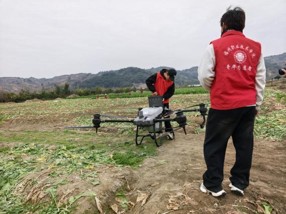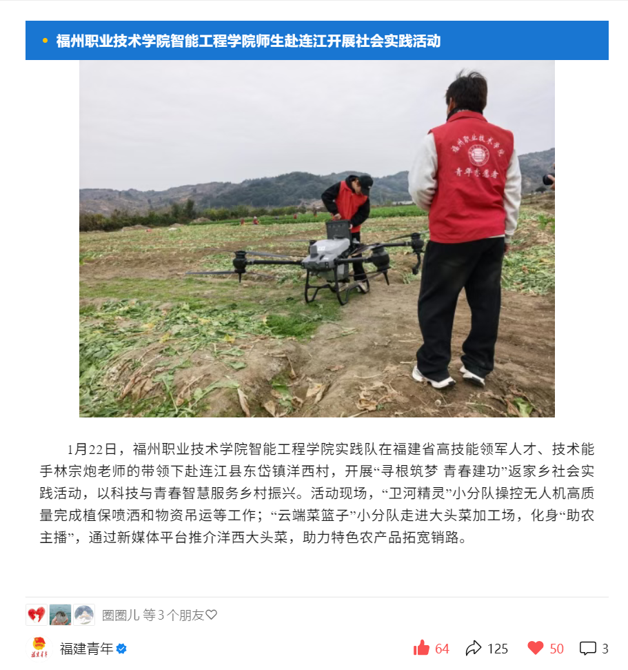 把課堂搬進(jìn)田野,讓技術(shù)扎根泥土。1月22日,“衛(wèi)河精靈”小分隊(duì)在福建省高技能領(lǐng)軍人才、技術(shù)能手林宗炮老師帶的領(lǐng)下赴連江縣東岱鎮(zhèn)洋西村,在“大頭菜”地開展無人機(jī)植保作業(yè)及物資吊運(yùn),用無人機(jī)應(yīng)用技術(shù)為鄉(xiāng)村振興注入青春智慧與技術(shù)能量。林宗炮老師現(xiàn)場為村干部與農(nóng)戶講解無人機(jī)技術(shù)在智慧農(nóng)業(yè)中的應(yīng)用前景與效率優(yōu)勢,將一堂生動的“移動專業(yè)課”開在了生產(chǎn)一線?!鞍颜n堂搬到田間地頭,才真正懂了‘學(xué)以致用’的意義?!睂?shí)踐隊(duì)隊(duì)員游昌平感慨道。隊(duì)員們紛紛表示,大家感受到農(nóng)業(yè)生產(chǎn)的艱辛,更體會到科技賦能的價(jià)值。