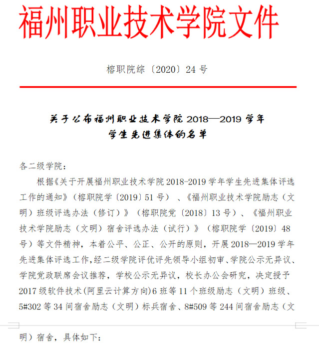 根據(jù)《關(guān)于開展福州職業(yè)技術(shù)學(xué)院2018-2019學(xué)年學(xué)生先進(jìn)集體評(píng)選工作的通知》(榕職院學(xué)〔2019〕51號(hào)) 、《福州職業(yè)技術(shù)學(xué)院勵(lì)志(文明)班級(jí)評(píng)選辦法(修訂)》(榕職院黨〔2018〕13號(hào))、《福州職業(yè)技術(shù)學(xué)院勵(lì)志(文明)宿舍評(píng)選辦法(試行)》(榕職院學(xué)〔2019〕48號(hào))等文件精神,本著公平、公正、公開的原則,開展2018—2019學(xué)年先進(jìn)集體評(píng)選工作,經(jīng)二級(jí)學(xué)院評(píng)優(yōu)評(píng)先領(lǐng)導(dǎo)小組初審、學(xué)院公示無異議、學(xué)院黨政聯(lián)席會(huì)議推薦,學(xué)校公示無異議,校長(zhǎng)辦公會(huì)研究,文化創(chuàng)意學(xué)院空中乘務(wù)18班等3個(gè)班級(jí)榮獲勵(lì)志(文明)班級(jí)稱號(hào)、3#504等38間宿舍榮獲勵(lì)志(文明)宿舍稱號(hào)、3#502等2間宿舍榮獲勵(lì)志(文明)標(biāo)兵宿舍稱號(hào)。