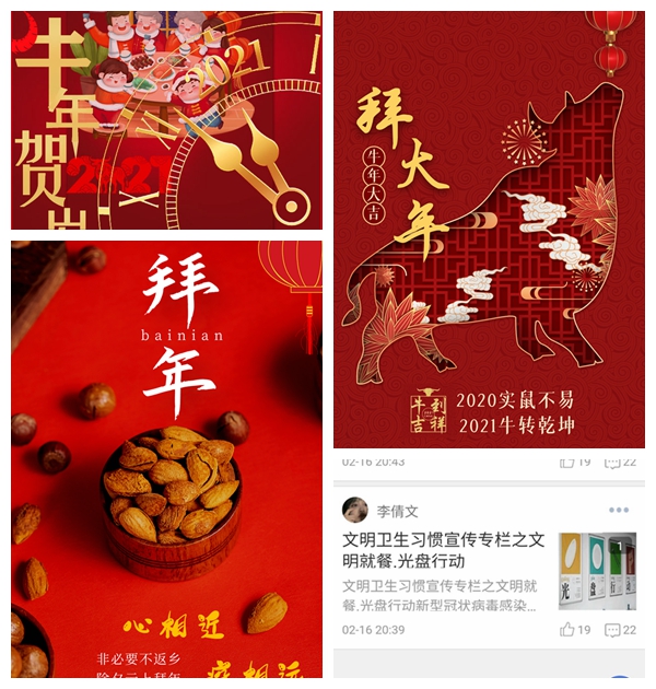 首先,我系動員學(xué)生錄制音視頻、設(shè)計制作電子賀卡等,向祖國、向親友進行網(wǎng)上拜大年;其次,我系面向?qū)W生征集“年味”主題照片和視頻,并通過易班平臺展示,充分展現(xiàn)了各地學(xué)子家鄉(xiāng)的獨特年味;與此同時,我們堅持開展“放假不停學(xué)”活動,通過在易班平臺搭建輕應(yīng)用、發(fā)布系列推文等形式,結(jié)合“四史”、防疫抗疫、厲行節(jié)約等重點內(nèi)容,開展學(xué)習(xí)活動,真正做到“停課不停學(xué)”。