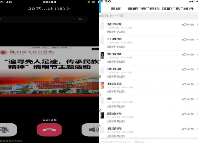 活動(dòng)中,同學(xué)們通過清明節(jié)主題班會(huì),深入了解了清明節(jié)的文化習(xí)俗,以及先烈們為解放國家而不惜犧牲自己生命的大無畏的英勇事跡。同時(shí),通過易班平臺(tái),組織全體師生參加“云祭掃”線上活動(dòng),在活動(dòng)簽名墻和留言板寫下對(duì)英烈的崇敬與懷念。