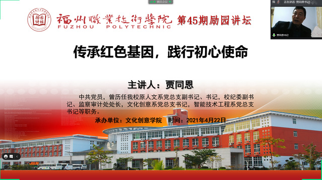 4月22日晚,由文化創(chuàng)意學(xué)院承辦的第四十五期勵(lì)園講壇通過騰訊會(huì)議直播順利舉行。本次講座由曾先后歷任我校原人文系黨總支副書記、書記,校紀(jì)委副書記、監(jiān)察審計(jì)處處長等職務(wù)的賈同恩同志主講,各學(xué)院學(xué)生和相關(guān)教師在線聆聽了講座。