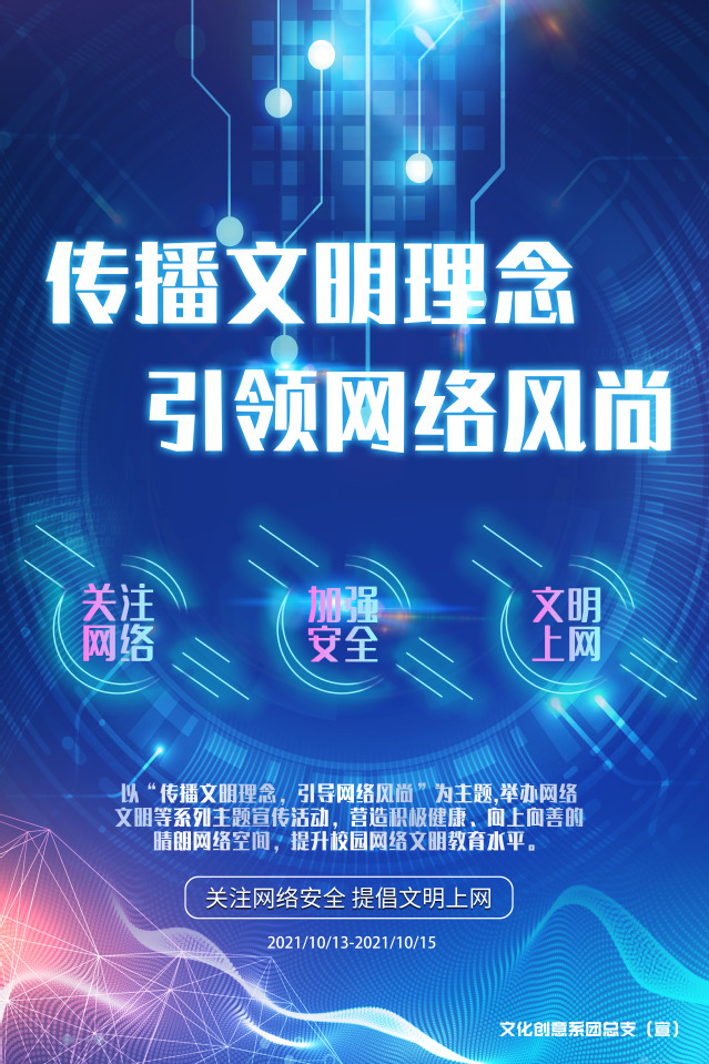 活動(dòng)期間,各班積極開(kāi)展“傳播文明理念 引領(lǐng)網(wǎng)絡(luò)風(fēng)尚”線上主題班會(huì),圍繞安全文明上網(wǎng)話題進(jìn)行熱烈討論,積極宣傳文明上網(wǎng)、網(wǎng)絡(luò)安全防患、抵制網(wǎng)絡(luò)低俗之風(fēng)、促進(jìn)網(wǎng)絡(luò)和諧共處等內(nèi)容,引導(dǎo)同學(xué)們正確使用網(wǎng)絡(luò),做到“健康上網(wǎng) 文明上網(wǎng)”。同時(shí),組織同學(xué)們觀看網(wǎng)絡(luò)安全視頻、制作網(wǎng)絡(luò)文明海報(bào)、拍攝網(wǎng)絡(luò)文明微視頻等活動(dòng),全面提升大學(xué)生的網(wǎng)絡(luò)素養(yǎng)。