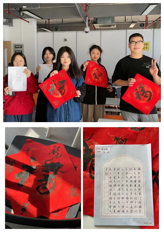 圖2 會展22-2班杜婧、會展22-2班孟玉盈、廣告23-2班黃冰瑩、會展22-2班姚鑫制作毛筆字書法和硬筆書法