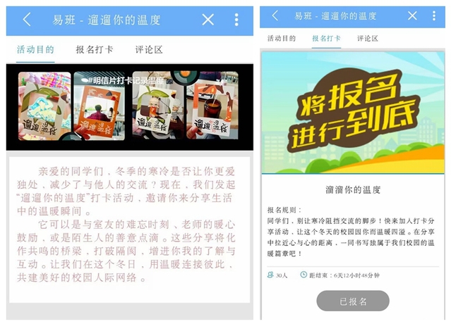 活動(dòng)期間,學(xué)院為參與者發(fā)放精心設(shè)計(jì)的主題打卡小卡片,鼓勵(lì)大家用心捕捉冬日里的每一個(gè)溫暖時(shí)刻,從細(xì)微小事中體會(huì)身邊的溫暖與幸福。無(wú)論是與舍友相處的溫馨日常、課堂上來(lái)自老師的鼓勵(lì)目光,亦或是校園中陌生人的一個(gè)善意微笑,都可成為大家記錄的美好瞬間。同時(shí),學(xué)院在易班搭建打卡平臺(tái),方便同學(xué)們進(jìn)行冬日暖心故事分享,讓大家共同感受溫暖與愉悅,向更多人傳遞這份正能量。評(píng)論互動(dòng)區(qū)里大家更是暢所欲言、交流心得,進(jìn)一步增進(jìn)了彼此間的情感,讓校園人際關(guān)系更加緊密和諧。