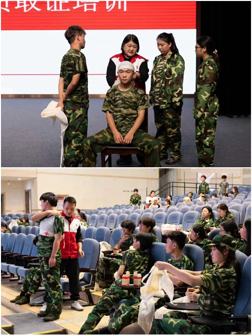 訓(xùn)練場(chǎng)上,隊(duì)列方陣步履鏗鏘,刺殺操方陣氣勢(shì)如虹,汗水浸透迷彩卻澆不滅昂揚(yáng)斗志。校外拉練中,學(xué)子踏破晨曦、挑戰(zhàn)極限,用腳步丈量堅(jiān)韌,以毅力致敬青春。校內(nèi)訓(xùn)練與校外實(shí)踐交織,在錘煉體魄的同時(shí)凝聚了集體榮譽(yù)感,讓團(tuán)結(jié)精神如紐帶般牢固。內(nèi)務(wù)整理中,疊被成方、物品歸位,細(xì)節(jié)之處錘煉自律品格。軍訓(xùn)期間還創(chuàng)新融入紅十字應(yīng)急救護(hù)培訓(xùn),通過(guò)理論講解與實(shí)操考核,學(xué)子們考取急救證書(shū),更將“生命至上”的理念深植于心,彰顯了新時(shí)代青年的責(zé)任擔(dān)當(dāng)。其間,學(xué)院領(lǐng)導(dǎo)親臨訓(xùn)練場(chǎng),看望慰問(wèn)參訓(xùn)學(xué)子,勉勵(lì)大家傳承紅色基因,錘煉過(guò)硬本領(lǐng)。結(jié)營(yíng)儀式上,分列式方陣整齊如磐石,刺殺操表演銳氣逼人,充分展現(xiàn)了文旅學(xué)子賡續(xù)抗戰(zhàn)精神、砥礪奮進(jìn)的新風(fēng)貌。