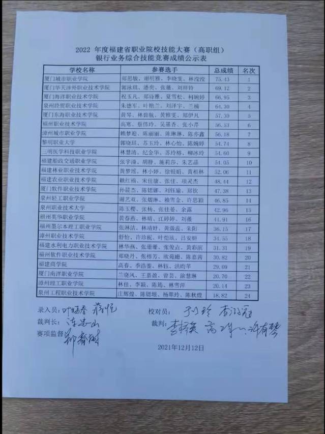 12月12日,由福建省教育廳,福建省人力資源和社會(huì)保障廳,福建省職業(yè)院校技能大賽組委會(huì)主辦的2022年度福建省職業(yè)院校技能大賽銀行業(yè)務(wù)綜合技能賽項(xiàng)(高職組)在廈門城市職業(yè)學(xué)院落下帷幕。來自全省24所高校的96位同學(xué)參與角逐。商學(xué)院2019級(jí)投資與理財(cái)專業(yè)高寒、2020級(jí)投資與理財(cái)專業(yè)吳基香、張小芹、2020級(jí)會(huì)計(jì)專業(yè)蔡偉玲(指導(dǎo)老師:陳建華、張佳)取得了全省第六、省二等獎(jiǎng)的好成績。