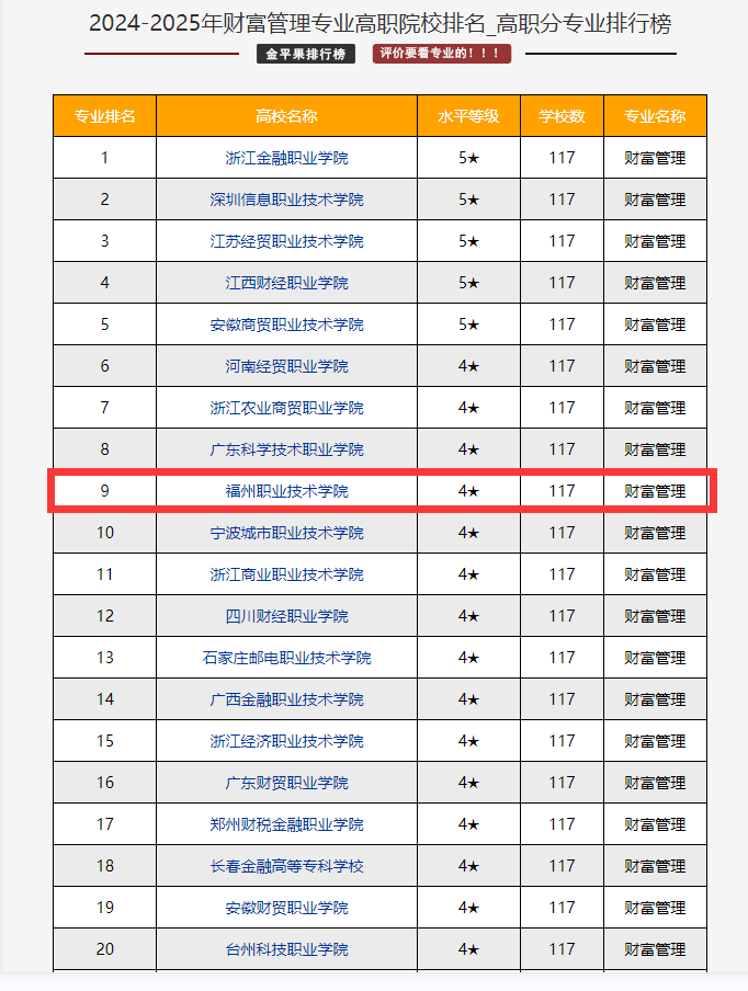 2024年5月21日,“金平果”發(fā)布“20241-2025高職分專業(yè)競(jìng)爭(zhēng)力排行榜”,全國(guó)高職院校開設(shè)投資與理財(cái)專業(yè)共計(jì)117所,我校財(cái)富管理專業(yè)在全國(guó)同類專業(yè)測(cè)評(píng)中取得全國(guó)第9名好成績(jī)。(圖文/張彬)