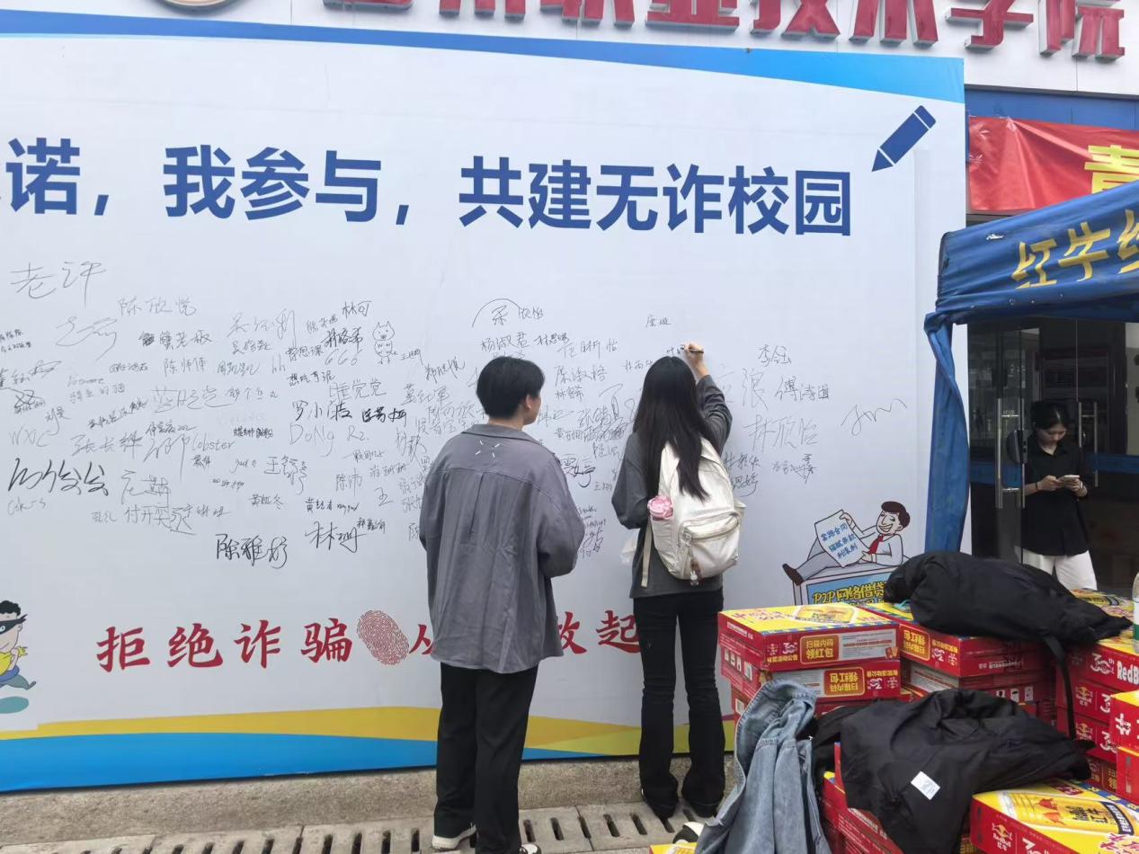 本次活動形式豐富多樣、精彩紛呈。在一站式學生社區(qū),以反詐知識答題為核心的第二課堂趣味十足,學生們通過掃碼答題,深入學習常見詐騙手段識別、反詐法律常識等知識,還能贏取青桔騎行卡、紅牛飲料、洗衣液、紙巾、水杯等精美禮品。與此同時,食堂和宿舍樓下的反詐主題展板圖文并茂,清晰解析了“殺豬盤”“校園貸”“冒充客服”等典型詐騙案例。志愿者們手持傳單,向過往學生耐心講解反詐技巧,將反詐知識送到學生生活的“第一線”。此外,在一站式社區(qū)設(shè)置的反詐倡議簽名墻,吸引了眾多學生前來簽署“反詐承諾”,強化了學生們的責任意識與參與感。通過在學生高頻活動區(qū)域布局宣傳,讓反詐知識無處不在,讓學生在耳濡目染中建立反詐思維,掌握防范技能,從源頭降低校園詐騙發(fā)生率。